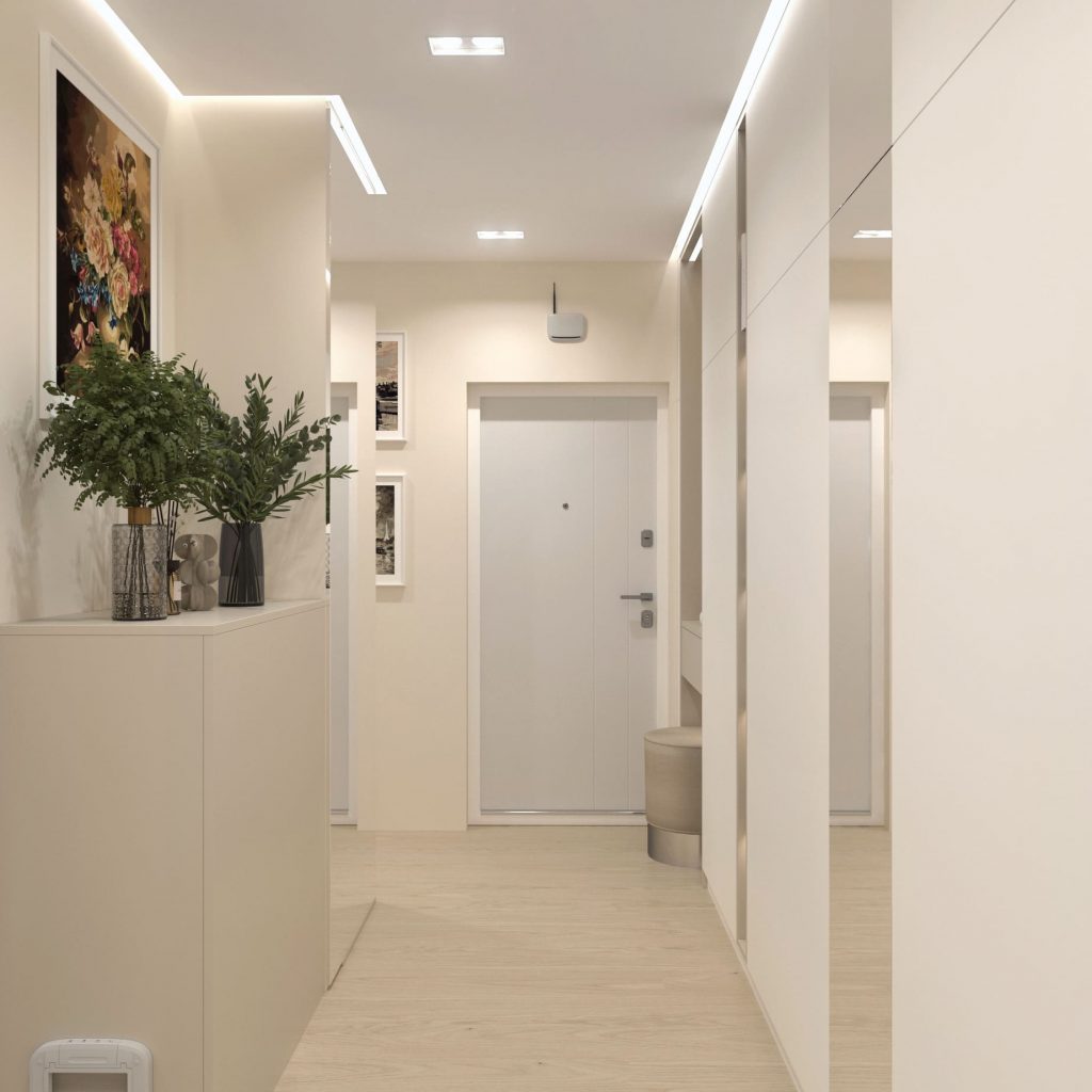 Белый цвет визуально расширяет коридор, отражая свет. Светлая мебель усилит эффект, но требует регулярной уборки;