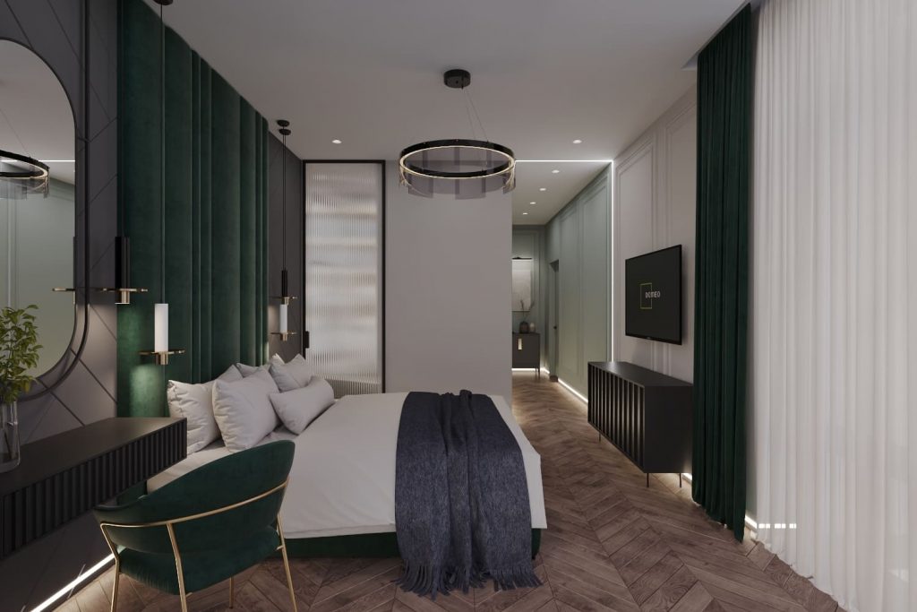 Интерьеры в этом стиле не терпят случайных решений. Каждая деталь здесь продумана: от мраморных столешниц до латунных ручек, от графичных обоев до многослойного освещения. При этом ар-деко умеет быть современным — с лаконичной планировкой, встроенной техникой и удобной мебелью, если всё это выдержано в характерной стилистике.