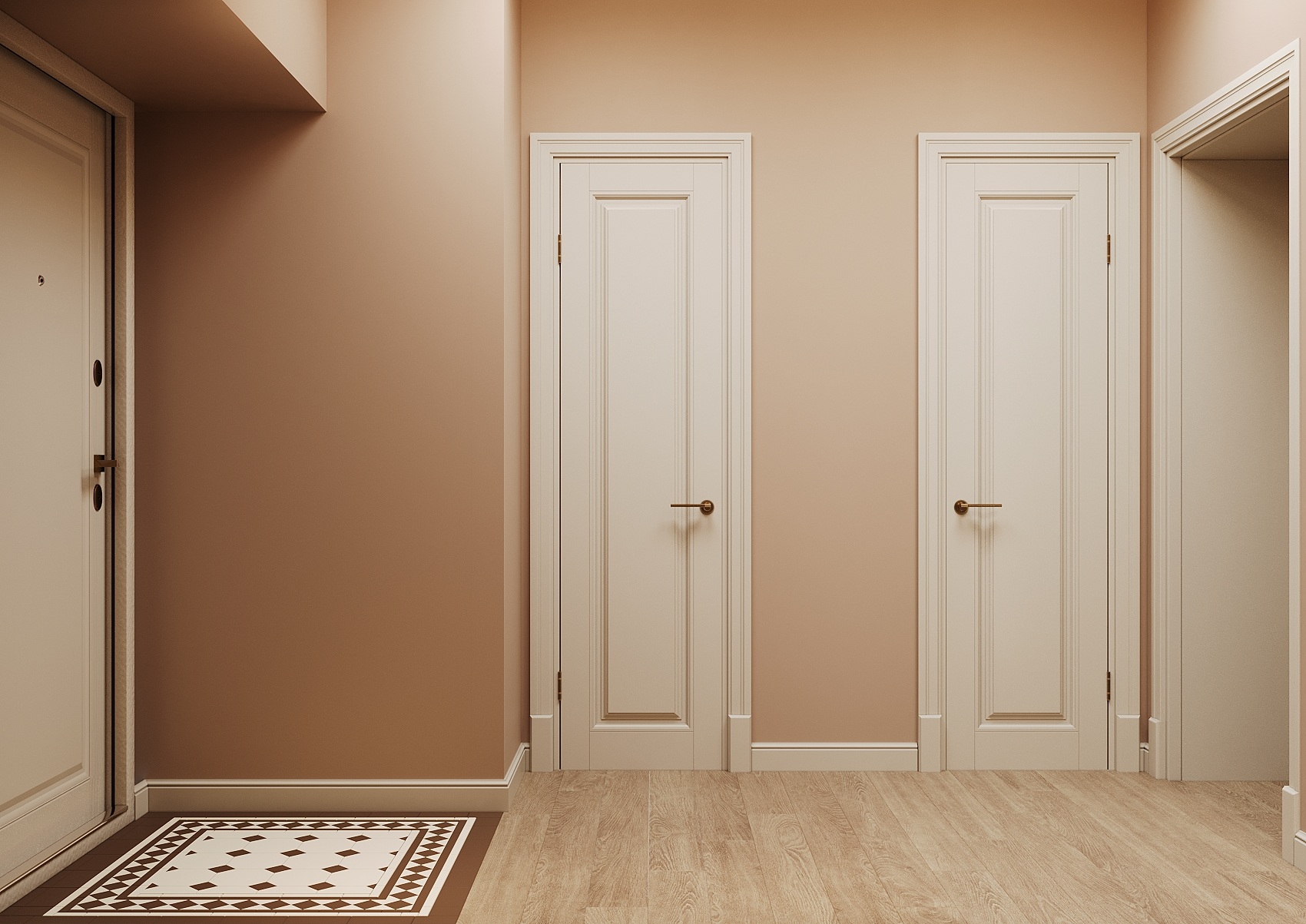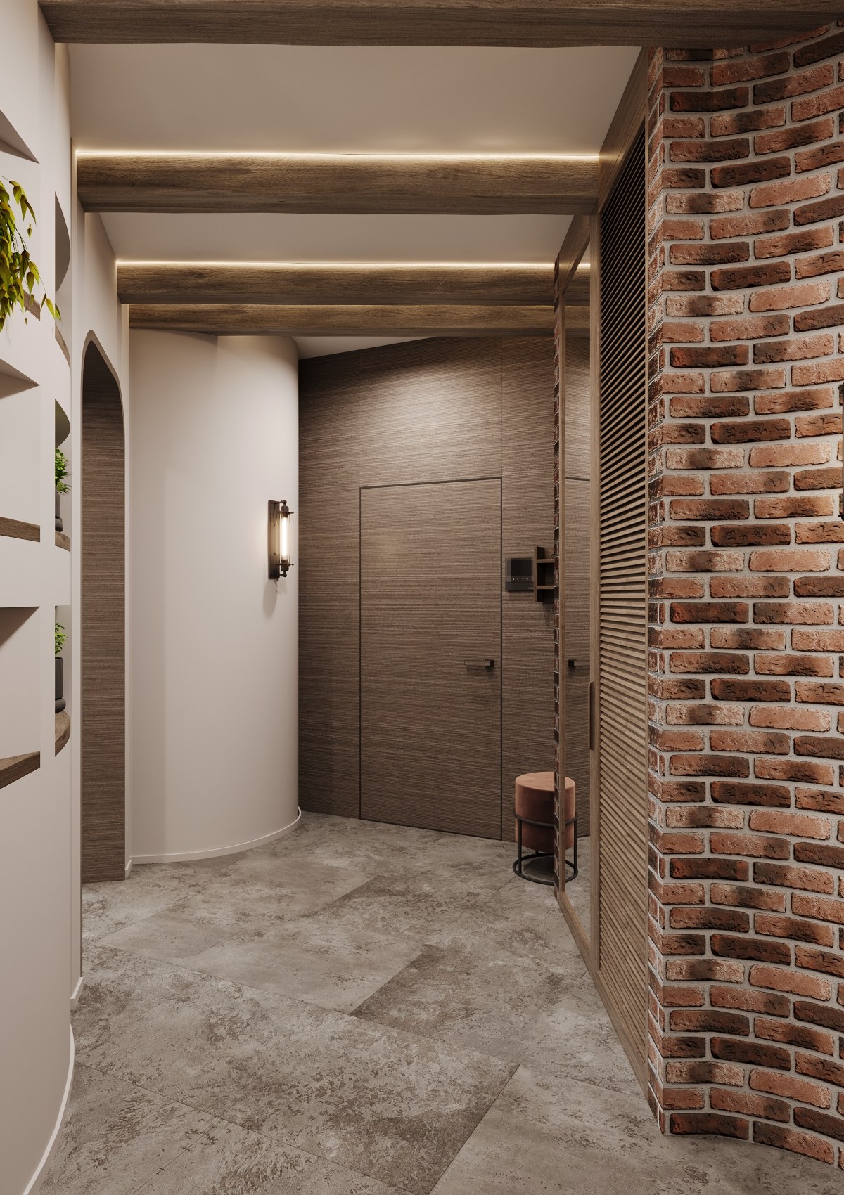 Организация коридора и прихожей начинается с двери, вписанной в стиль, и компактного хранения: узкие консоли, настенные крючки, шкаф-купе до потолка. Главное — не перегрузить проход, оставив воздух и вертикальные линии.