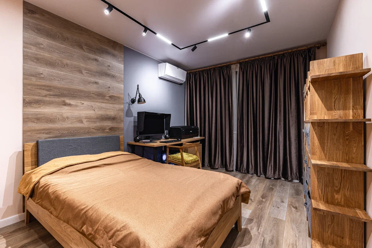 🔹 В спальнях можно организовать гардеробную вдоль стены или за изголовьем кровати — вещи не занимают полезную площадь, но всегда под рукой