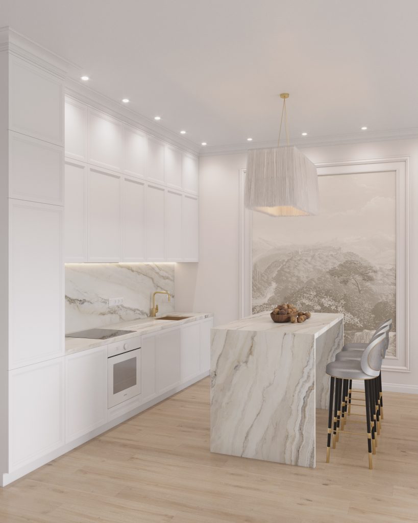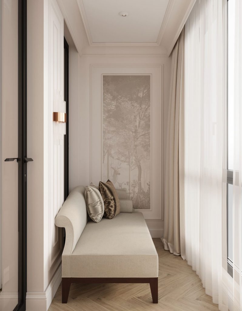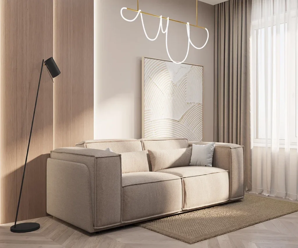 Равномерное освещение с мягким теплым или нейтральным белым светом усиливает ощущение простора. Встроенные или потолочные светильники создают общий фон, а бра, торшеры и подсветка мебели добавляют глубины и акцентов. Светлые поверхности хорошо отражают свет, поэтому зеркала и стеклянные элементы усиливают эффект. Точечные светильники или светодиодные ленты вдоль стен создают мягкое свечение, подчеркивая легкость интерьера. Лучше избегать слишком холодного света, чтобы интерьер не выглядел стерильным, а вместо этого выбирать теплые оттенки для уюта.