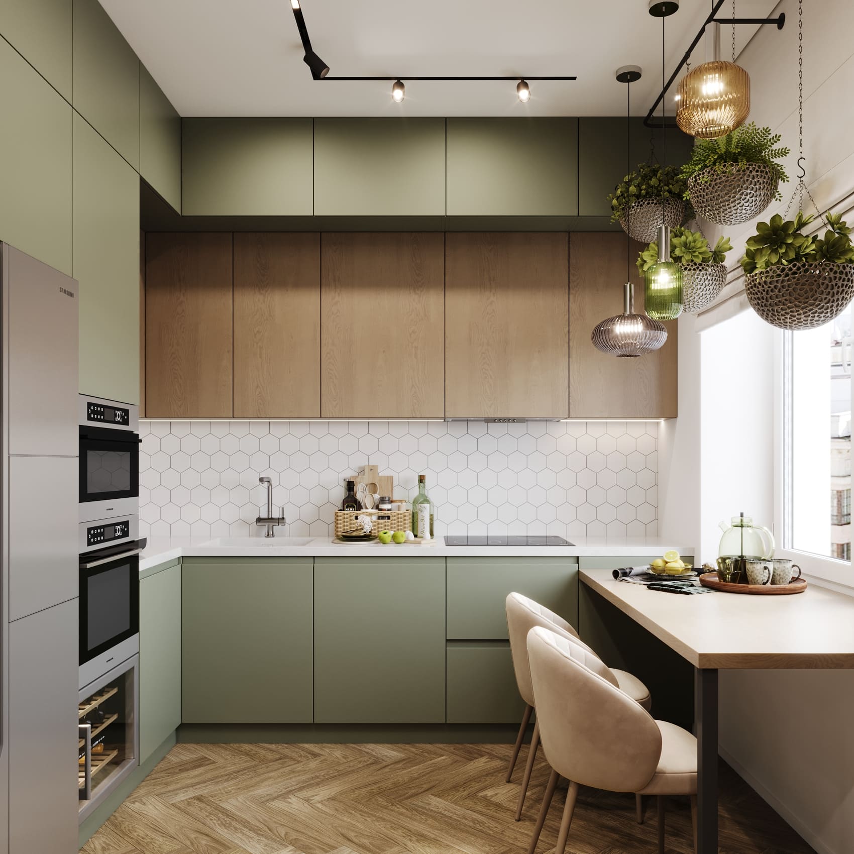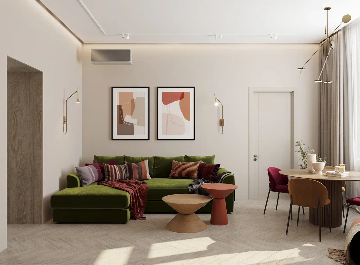 Этот стиль для квартир в старом фонде особенно актуален: высокие потолки и большие окна смягчаются текстилем, деревянными деталями и мягким приглушенным светом. Цветовая гамма — природные оттенки: песочный, терракотовый, оливковый, молочный. Важную роль играют тактильные ощущения: шерстяные пледы, льняные шторы, матовая керамика и дерево с естественной фактурой.
