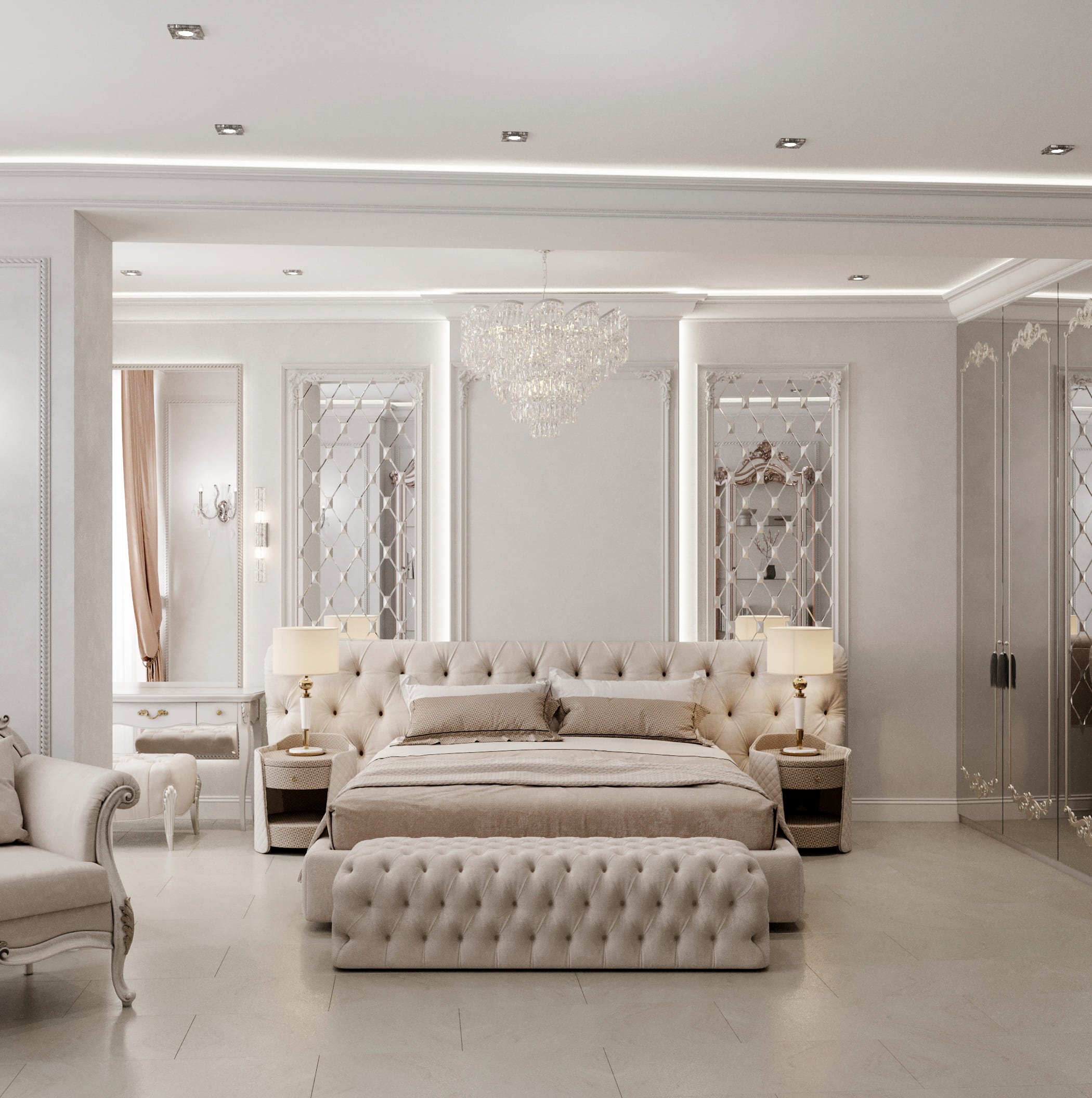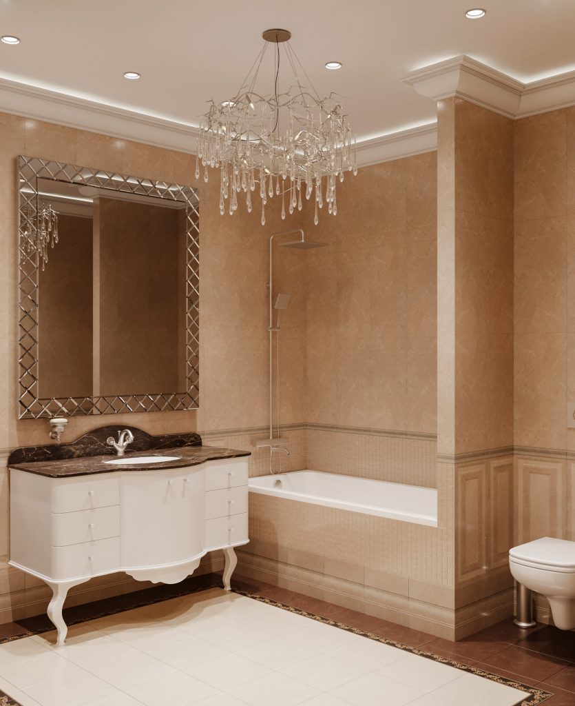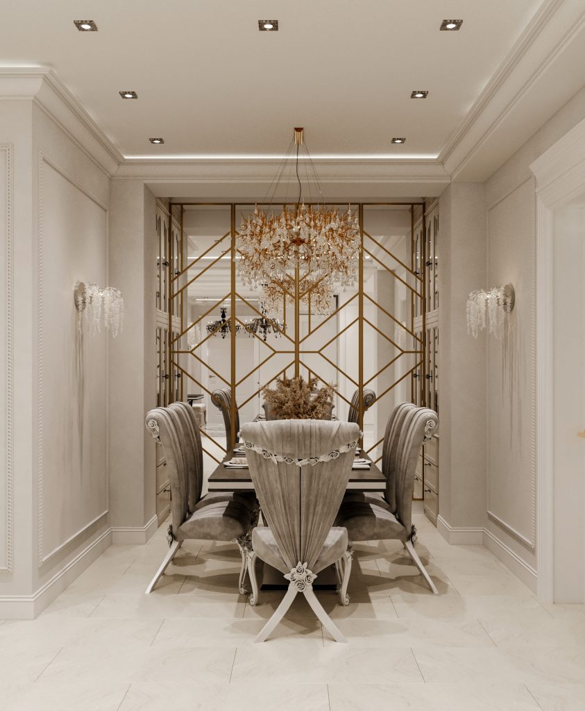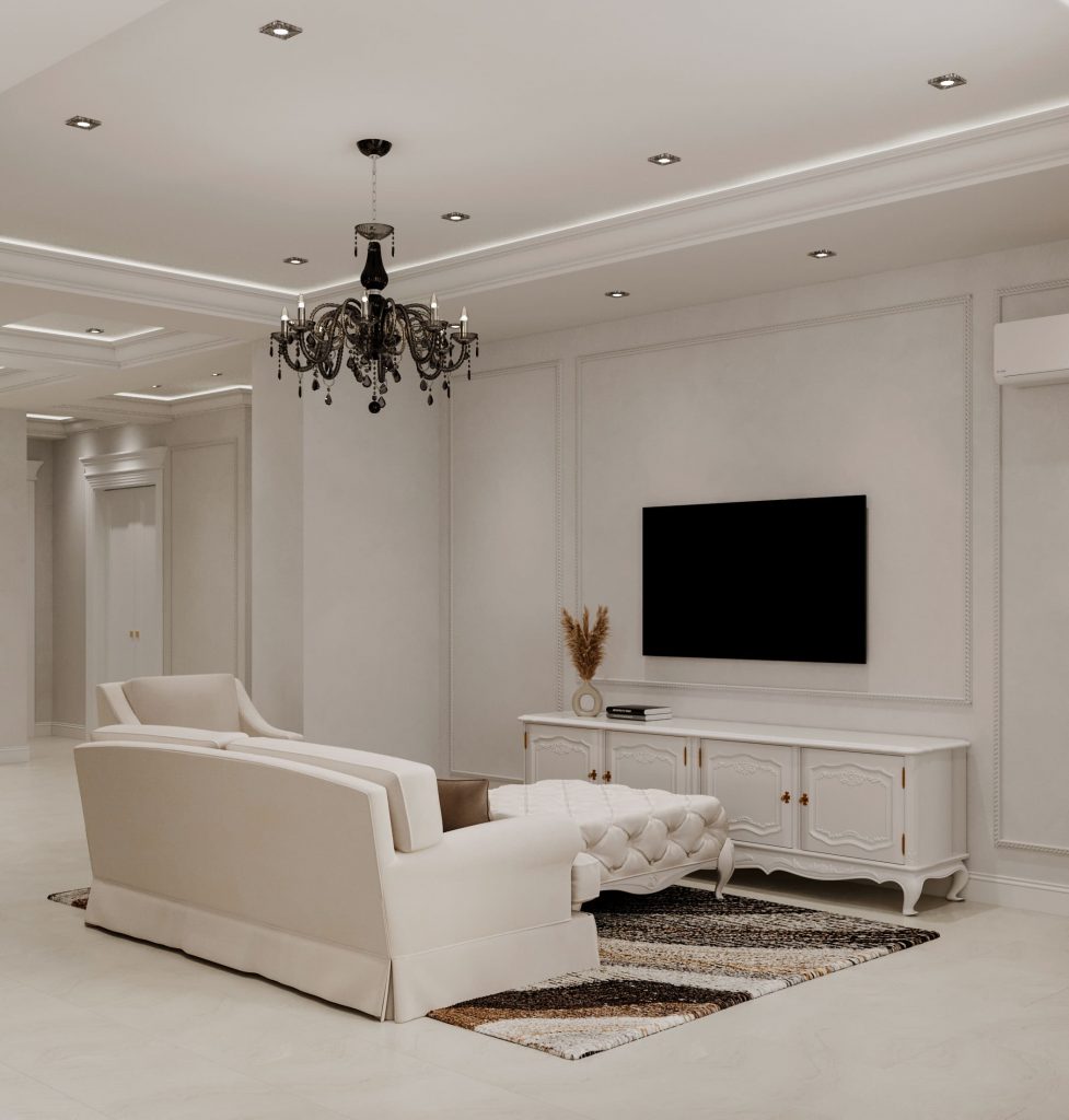 ◾ Многоуровневое освещение — центральная люстра, настенные бра, торшеры, встроенные светильники;