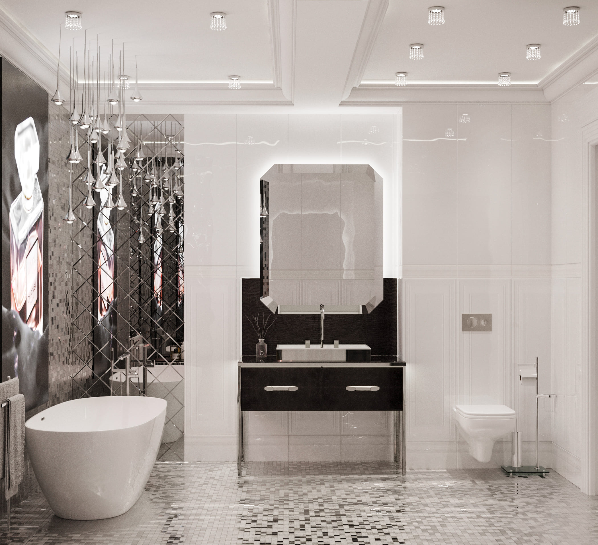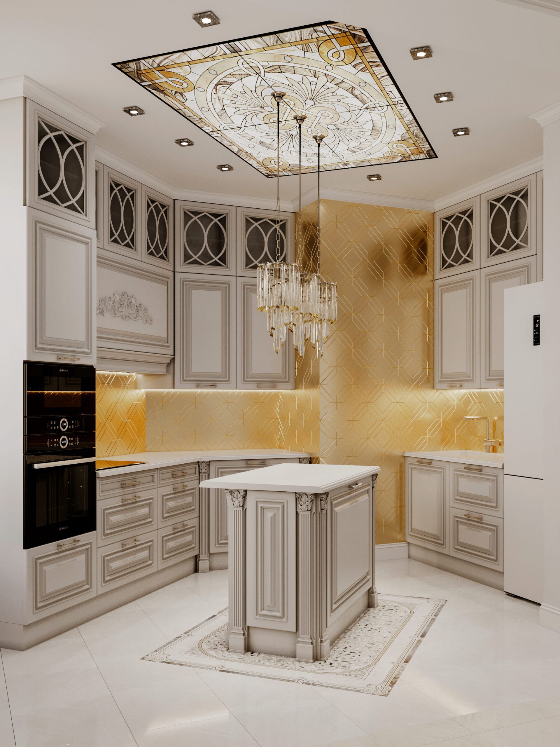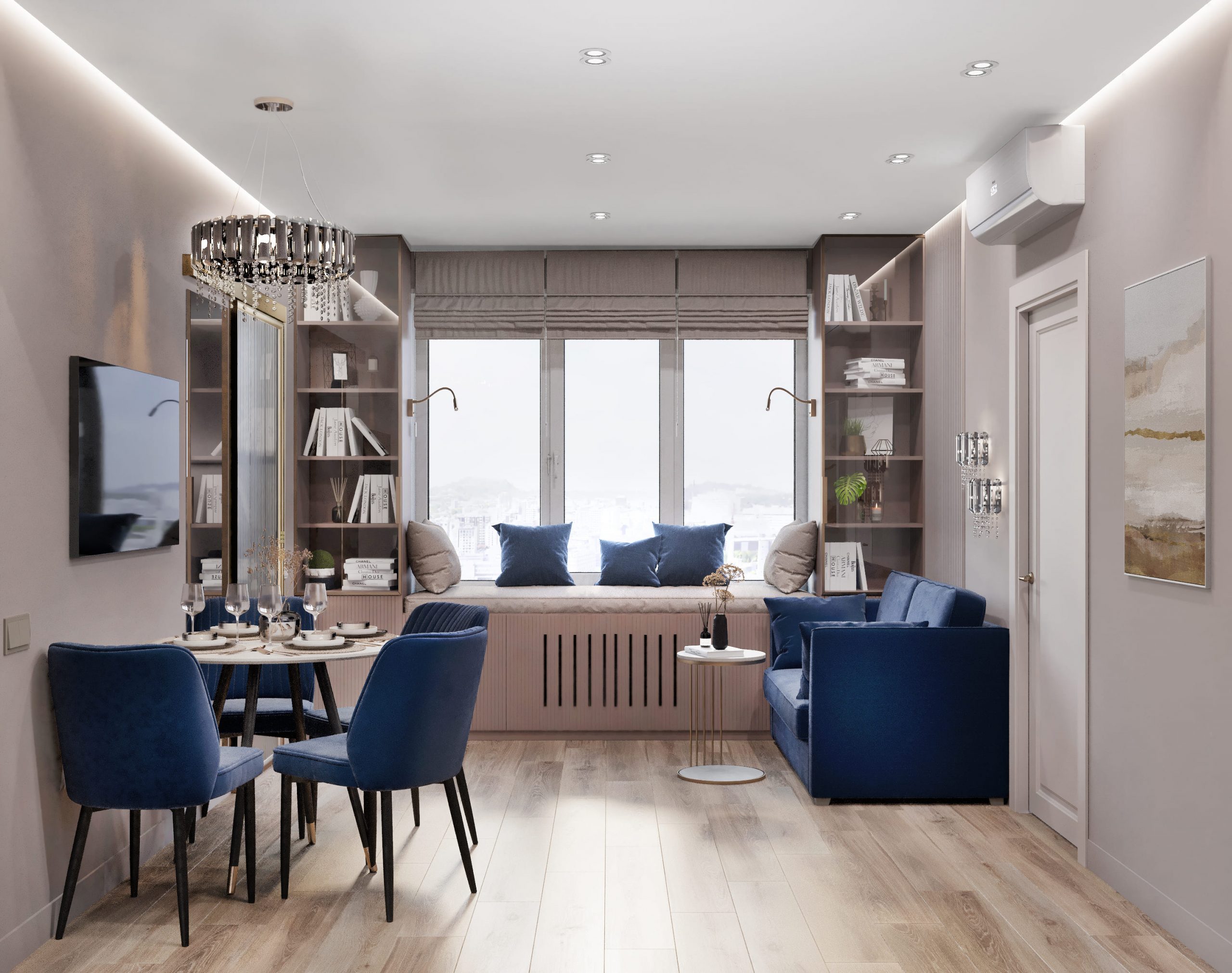 ◾ Многоуровневое освещение — центральная люстра, настенные бра, торшеры, встроенные светильники;