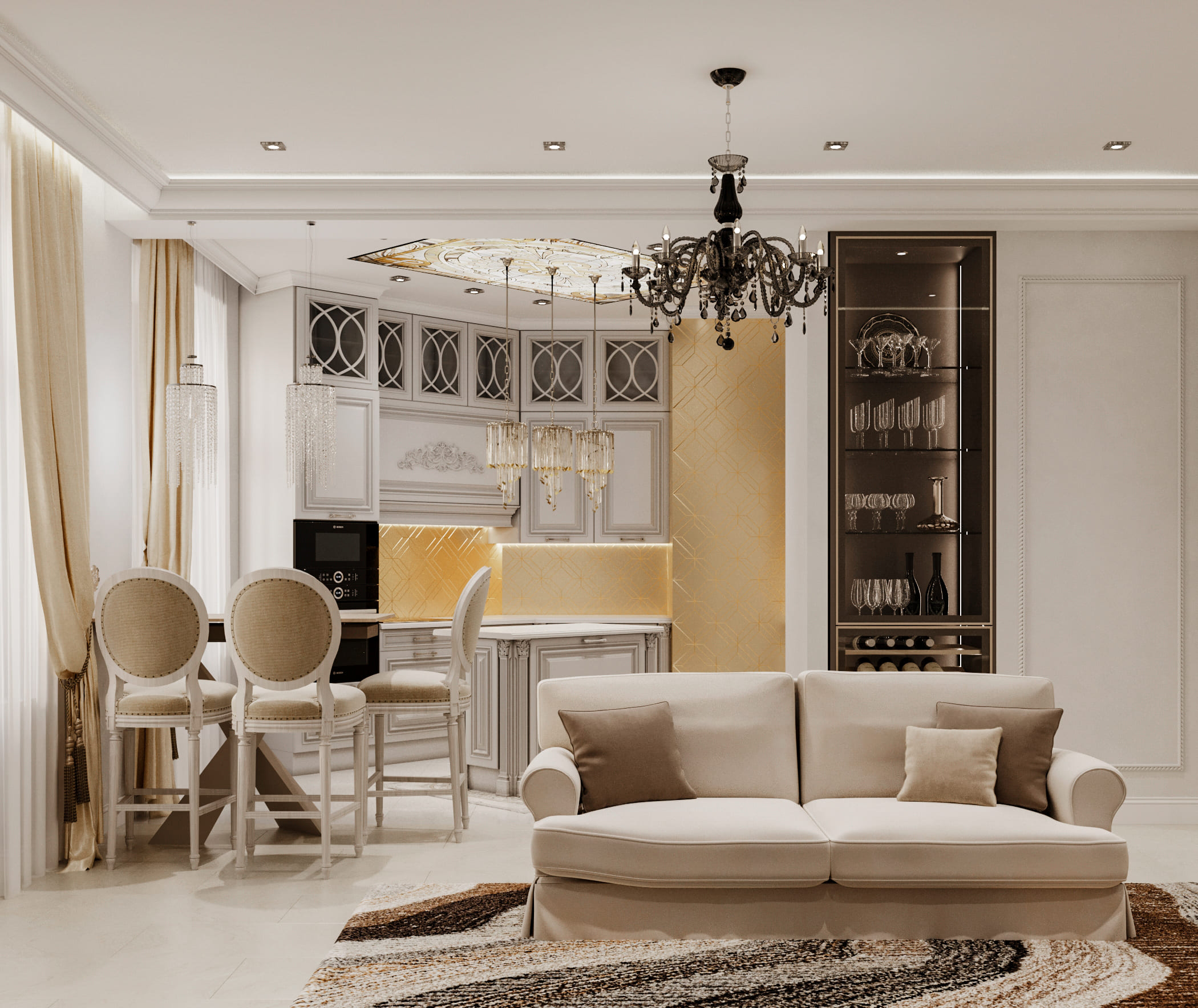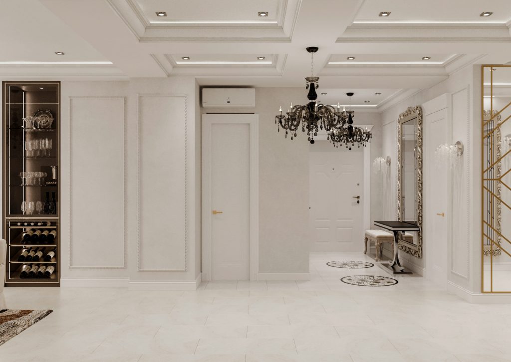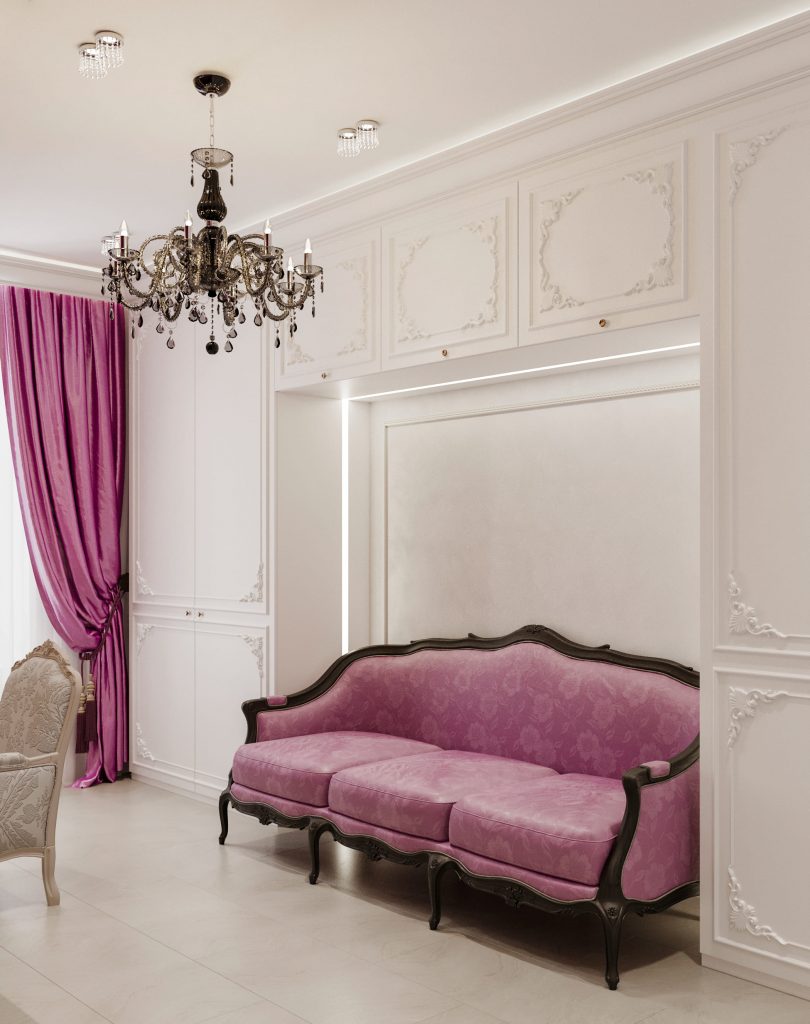 Этот подход предполагает сохранение и восстановление исторических элементов: лепнины, розеток, дубовых паркетных полов. Мебель и декор выбираются в классическом или неоклассическом ключе, но с современным наполнением.