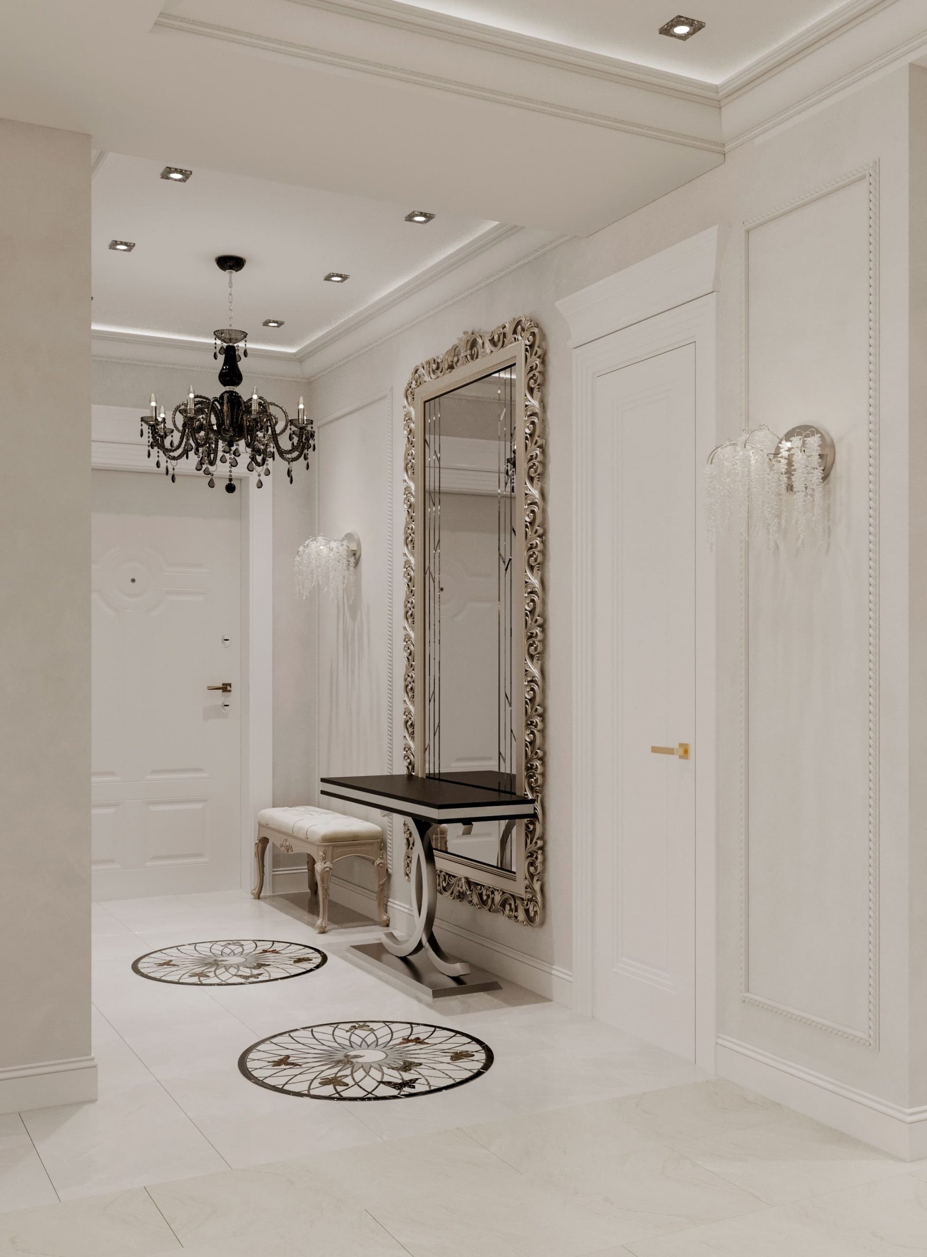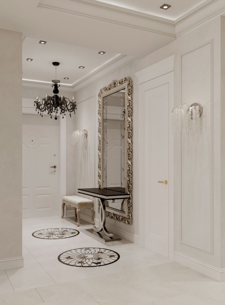 ◾ Зеркала в массивных рамах — визуально расширяют пространство и обыгрывают высоту потолков;