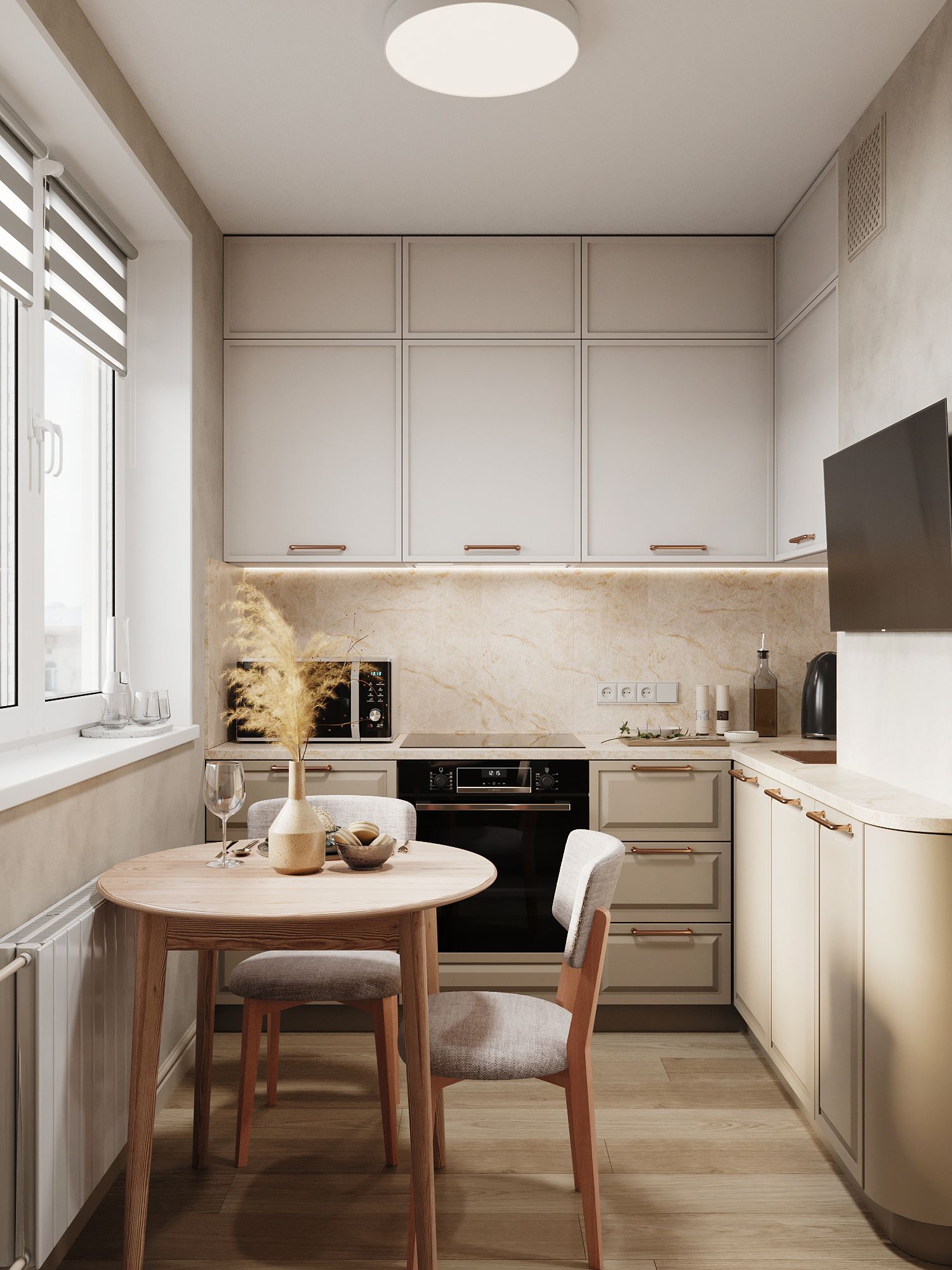 Однако это не значит, что пространство нельзя сделать удобным и стильным. Здесь не нужно ломать конструкции — достаточно грамотно расставить мебель, обыграть эркер и продумать сценарии освещения.