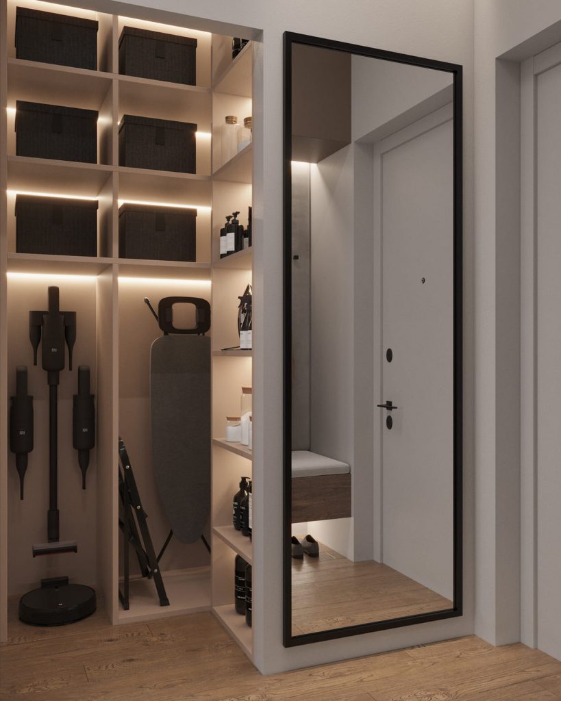Рассмотрите вариант объединения кладовки с прилегающей прихожей. В расширенном помещении можно провести зонирование, создав отдельные секторы для хранения одежды и организации хозяйственного инвентаря.