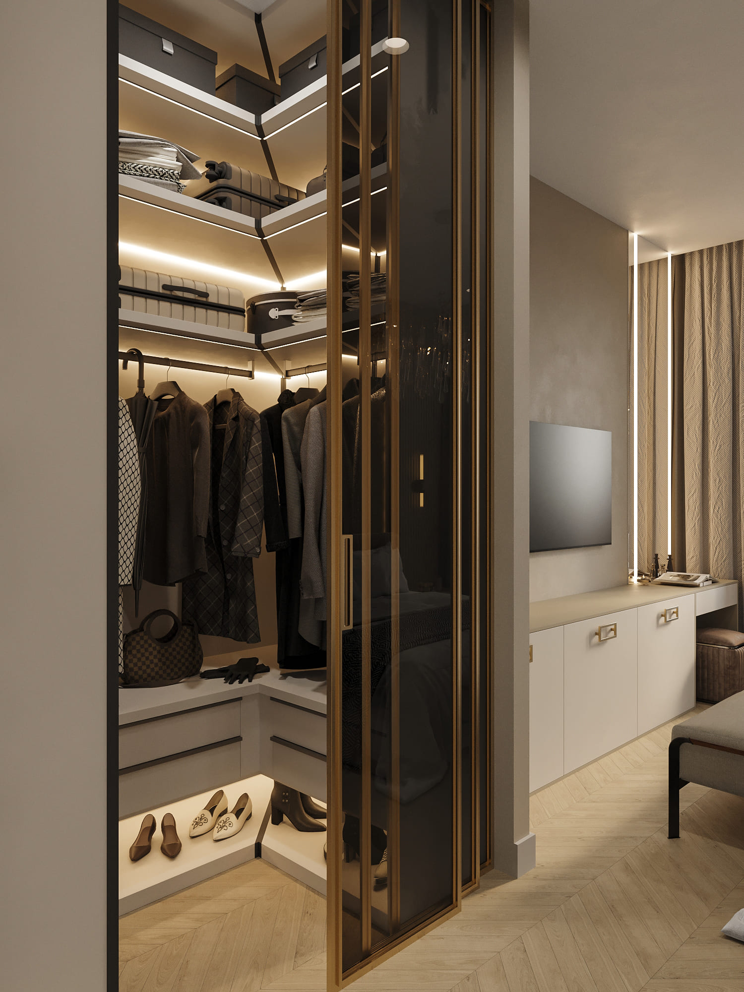 Превратите даже маленькую гардеробную в свой личный хаб: добавьте туда компактный письменный стол или туалетный столик для косметики. Теперь все ваши утренние ритуалы — от выбора образа до макияжа — будут собраны в одном месте.