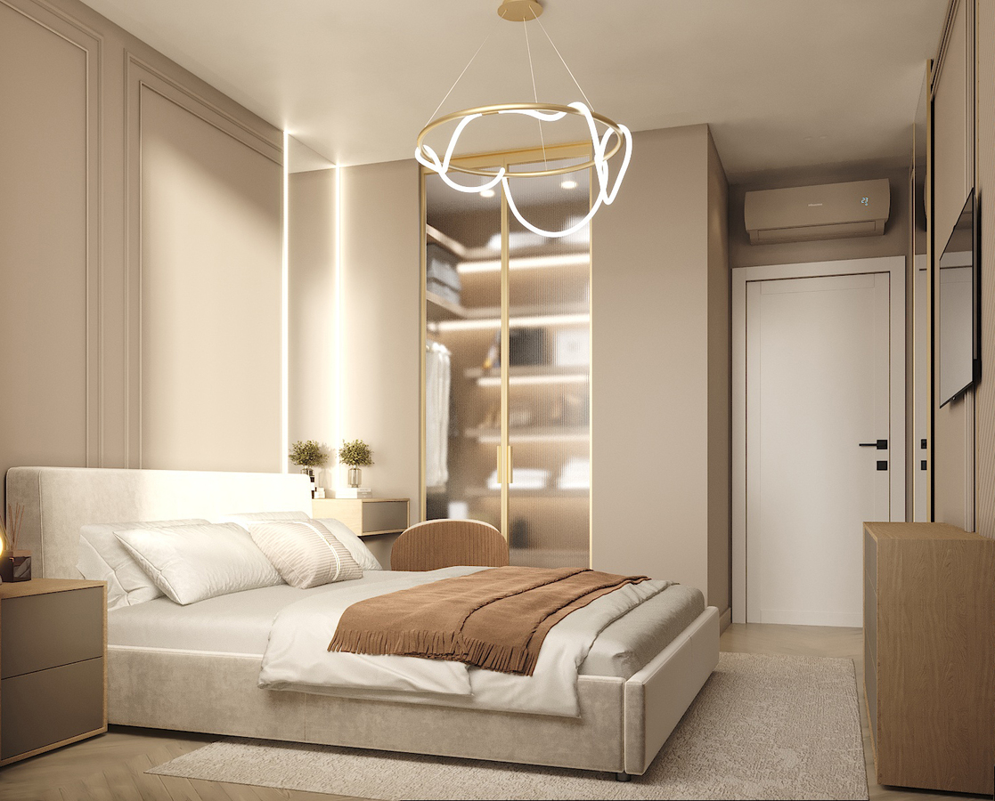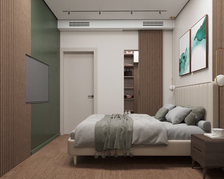 Этот вариант хорошо подходит для просторных квартир или домов. Например, разместив гардеробную между спальней и ванной, вы получите пространство, обеспечивающее удобный и быстрый доступ к одежде, обуви и аксессуарам. Это создаст функциональную и гармоничную зону хранения.
