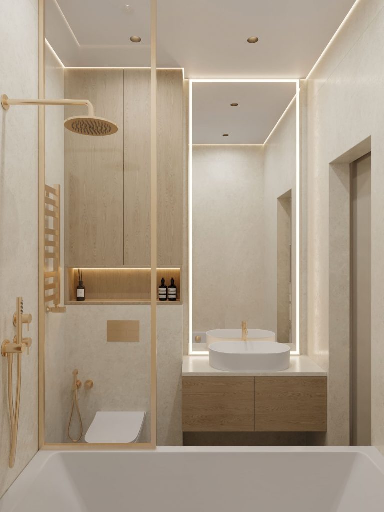 Например: Выберите душевую кабину с прозрачными стеклянными дверцами — это визуально расширит пространство и добавит легкости интерьеру. Дополните её компактными полками или нишами для хранения банных принадлежностей, чтобы сохранить порядок и эстетику.