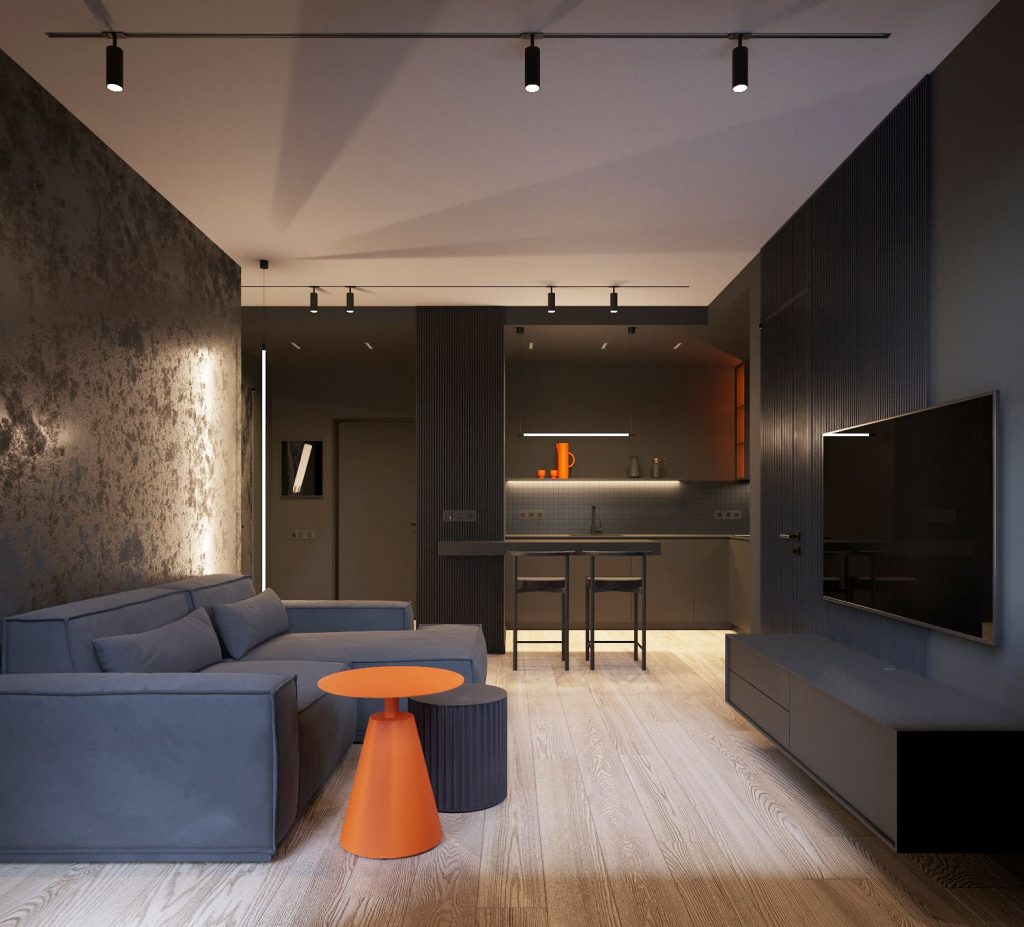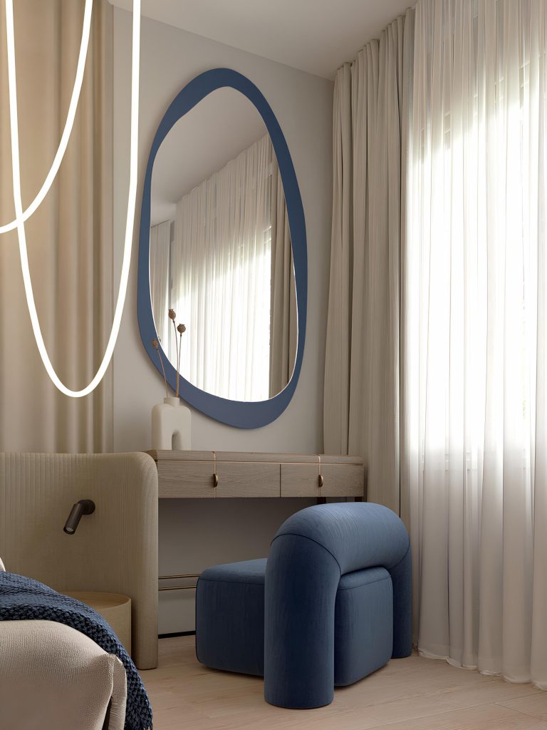 2. Контрастные акценты: черный, темно-синий, графитовый, глубокий зеленый — используются умеренно, подчеркивая детали и геометрию интерьера;