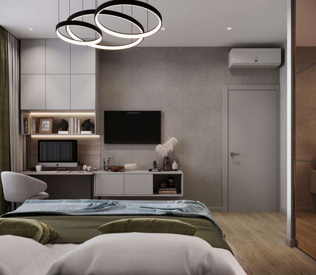 В спальне преобладают мягкие нейтральные тона — серый, беж и дерево создают гармоничную, «дышащую» палитру. Акцентная стена за изголовьем с деревянными рейками и подсветкой визуально увеличивает пространство. Мягкое изголовье и подвесные светильники со стеклянными плафонами подчёркивают комфорт и современный стиль.