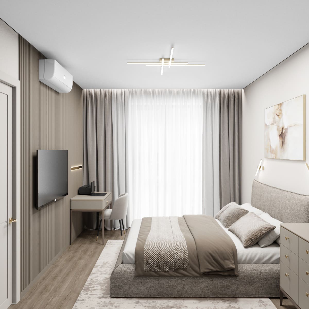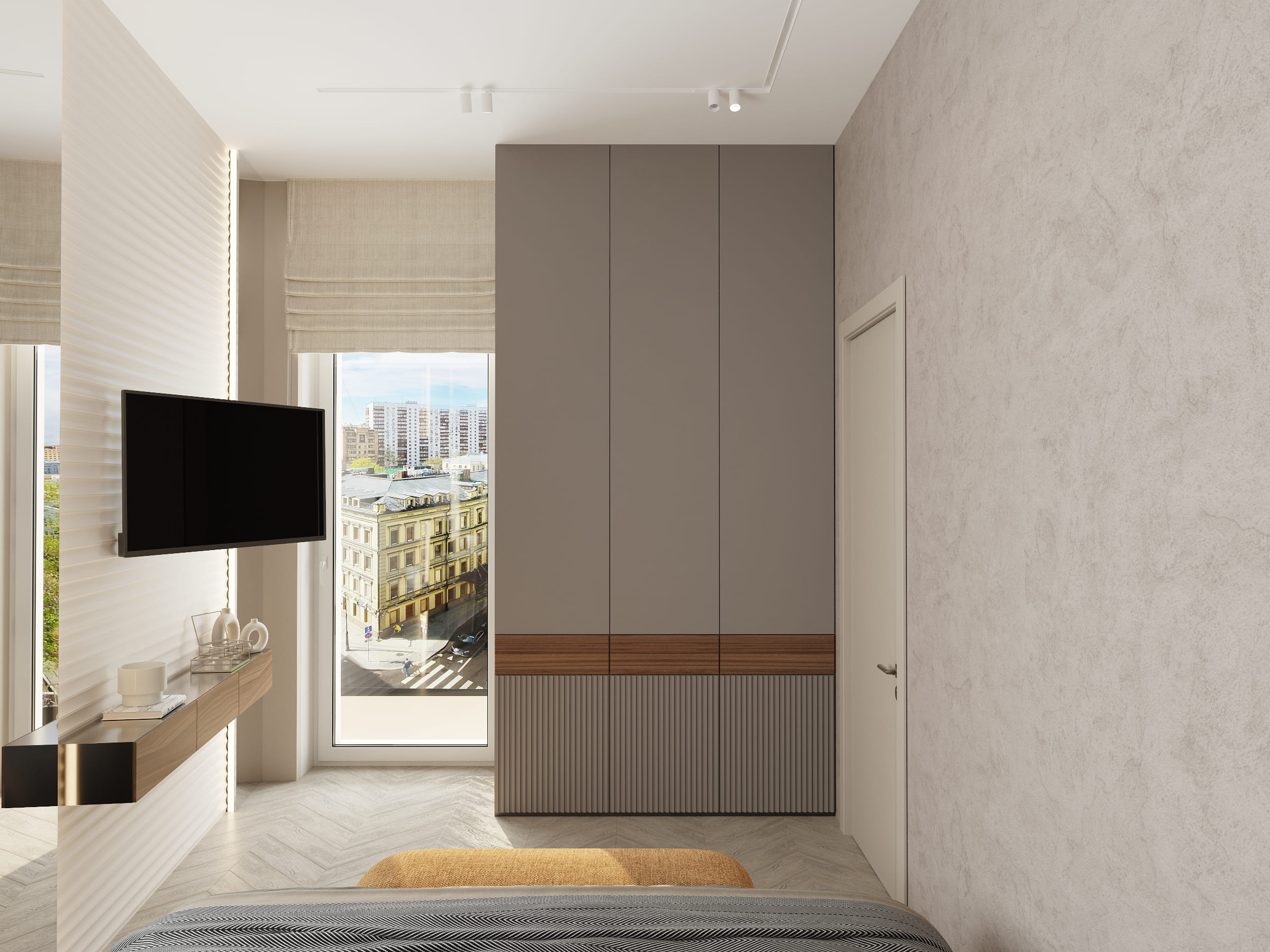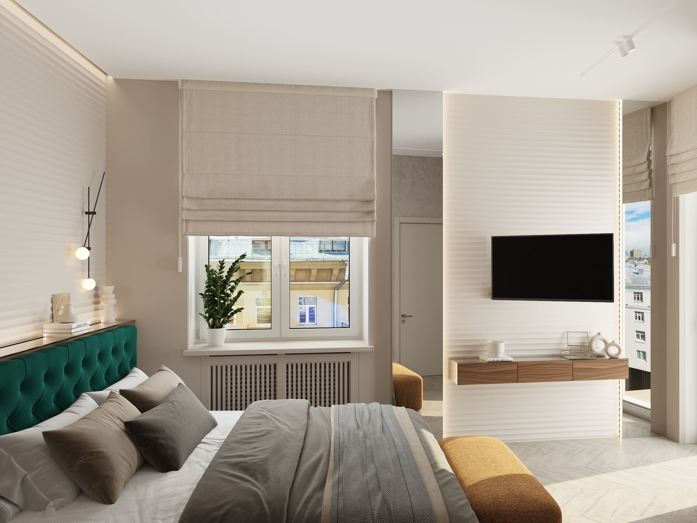 ◆ Зона отдыха: Большая кровать с минималистичными тумбочками, ТВ-панелью и подвесной тумбой;