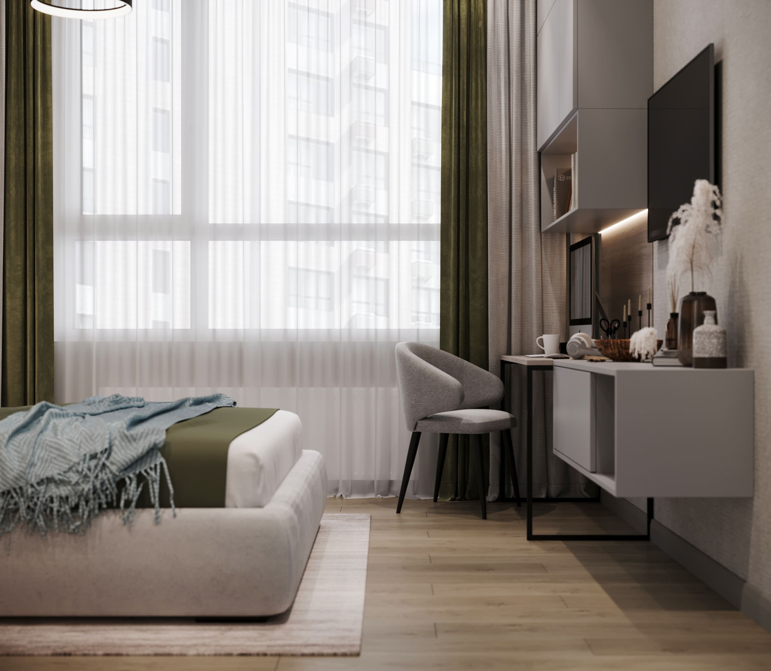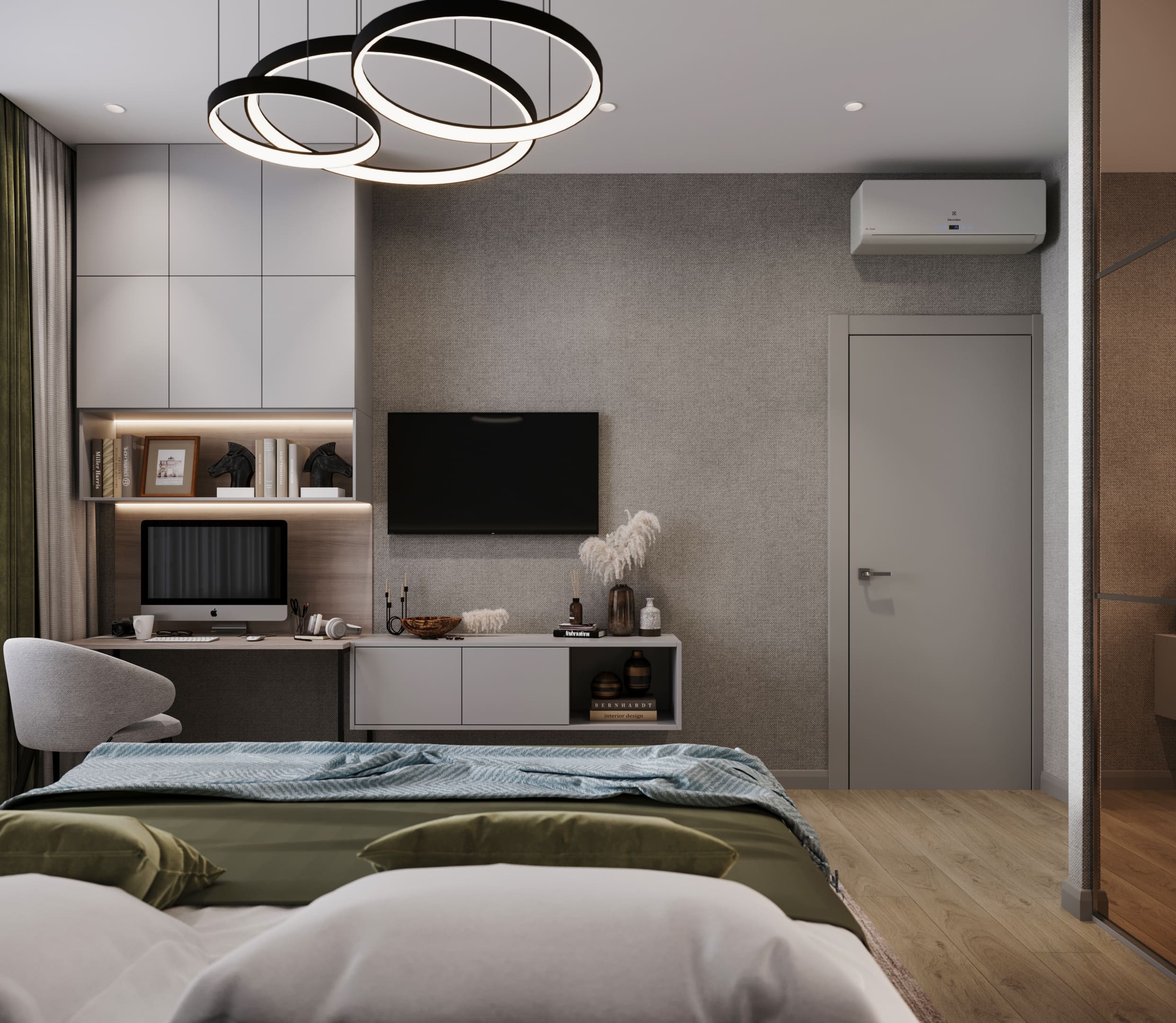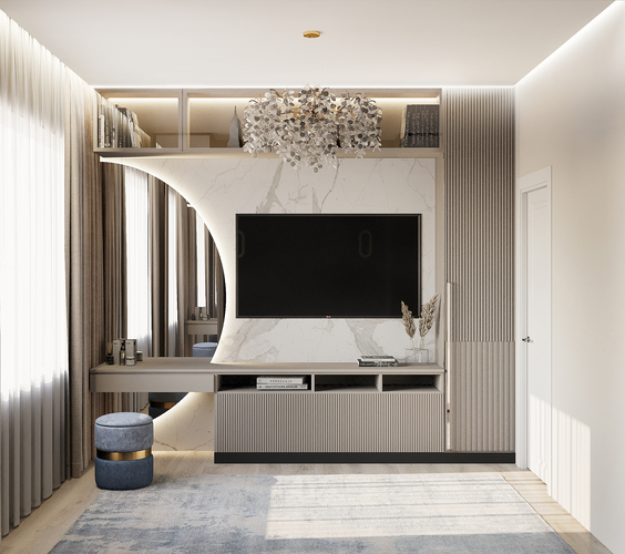 ◆ Зона отдыха: Большая кровать с минималистичными тумбочками, ТВ-панелью и подвесной тумбой;