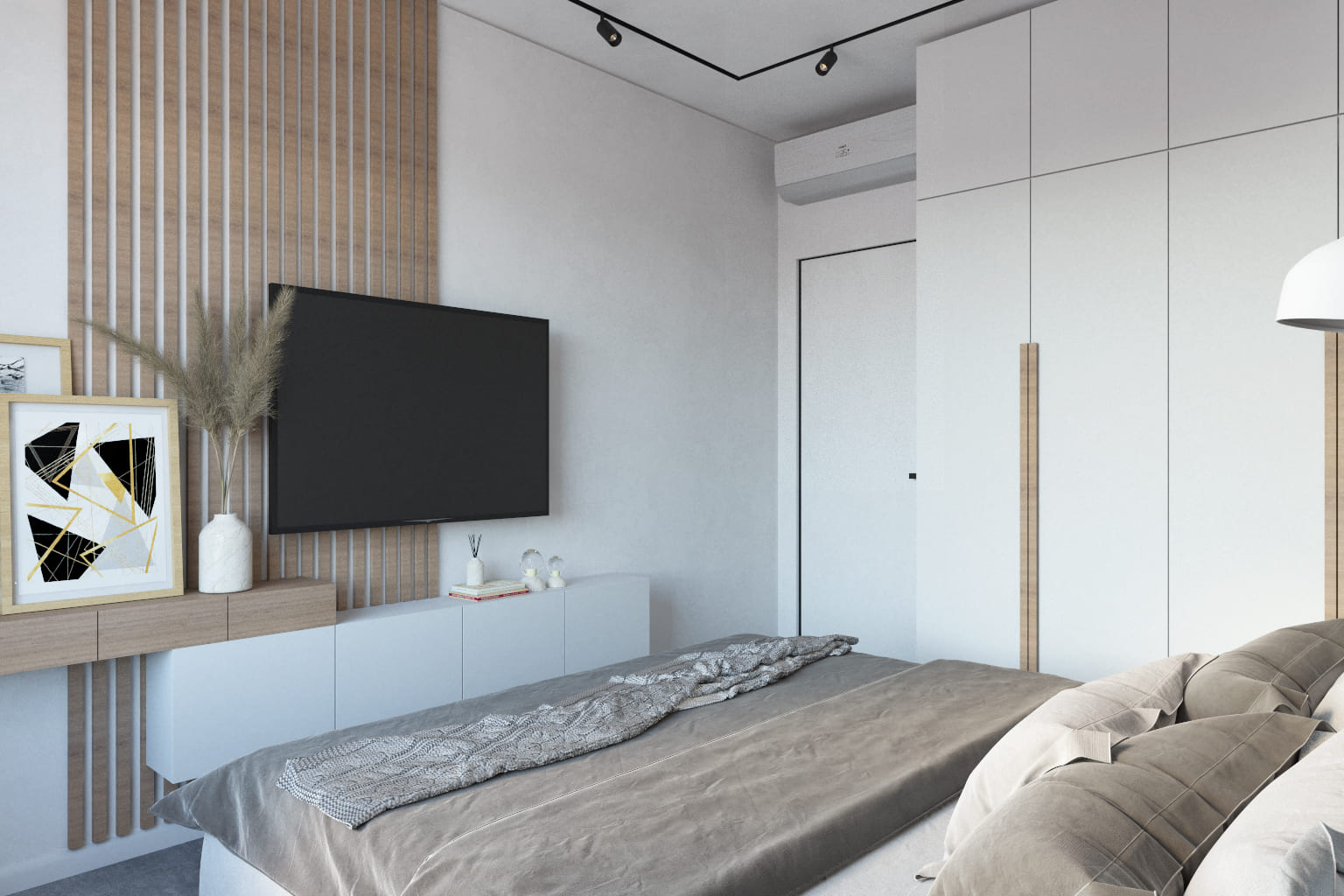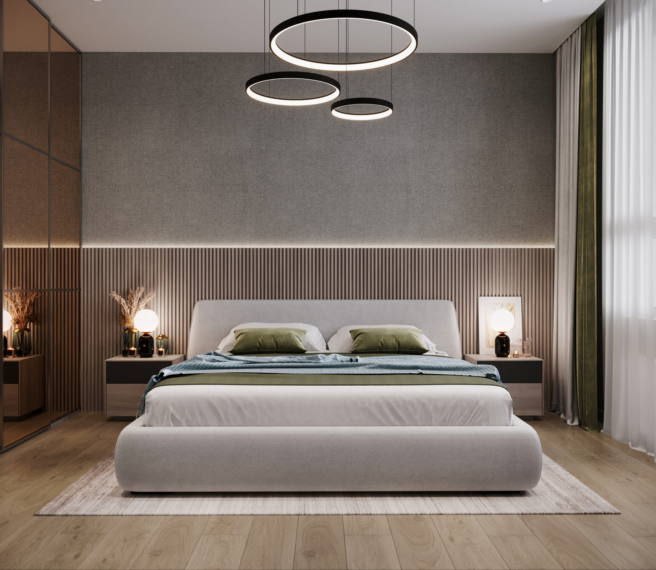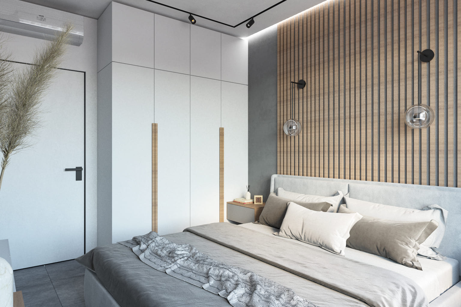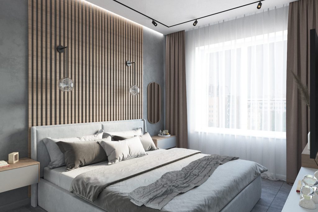 В спальне преобладают мягкие нейтральные тона — серый, беж и дерево создают гармоничную, «дышащую» палитру. Акцентная стена за изголовьем с деревянными рейками и подсветкой визуально увеличивает пространство. Мягкое изголовье и подвесные светильники со стеклянными плафонами подчёркивают комфорт и современный стиль.