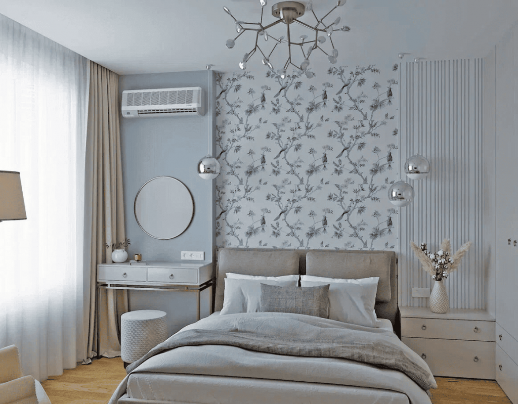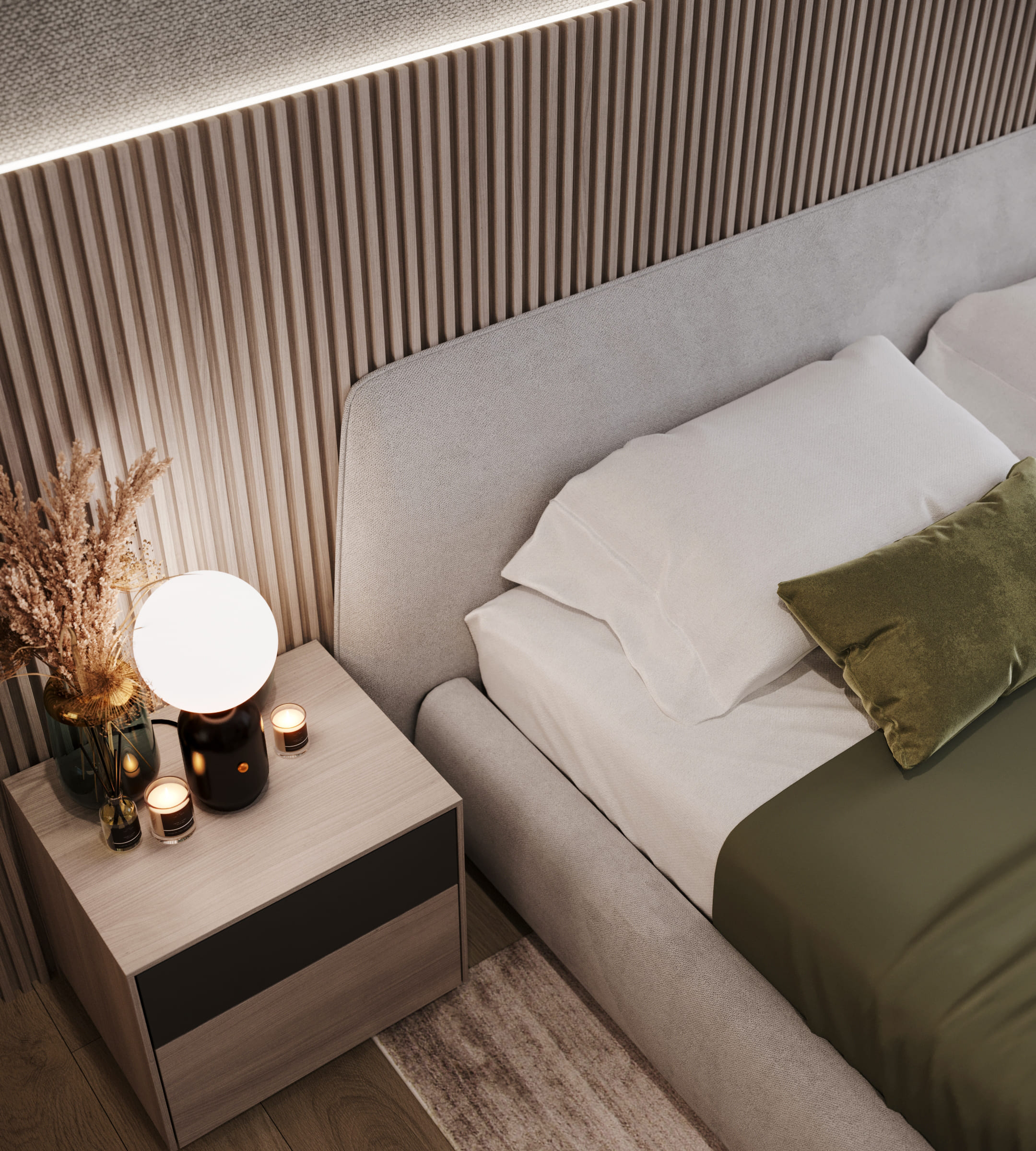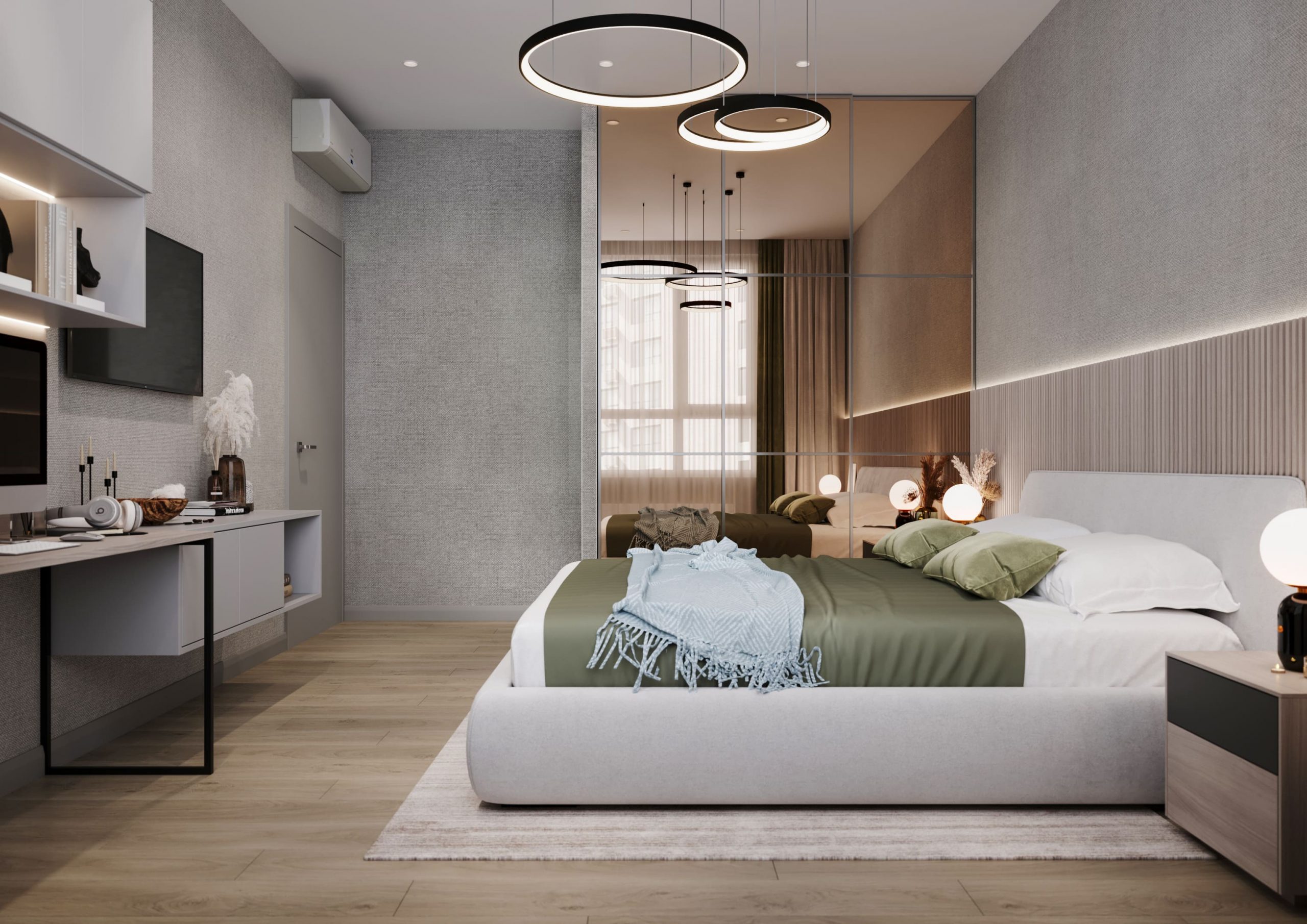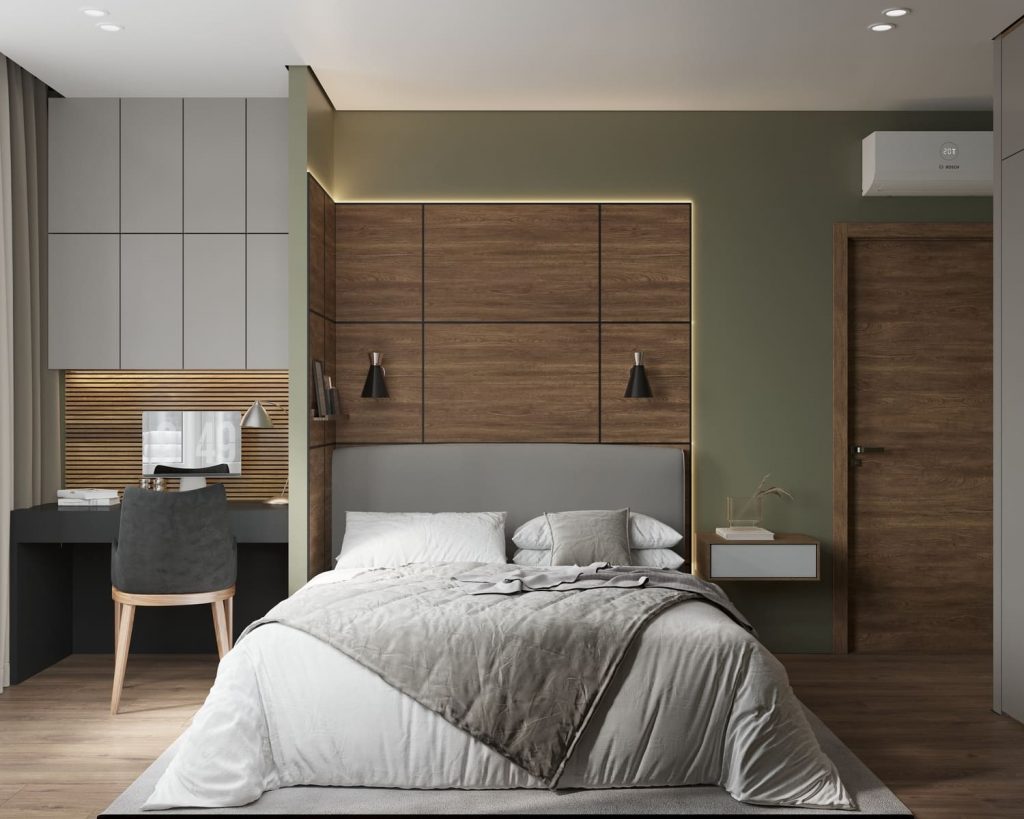 В спальне преобладают мягкие нейтральные тона — серый, беж и дерево создают гармоничную, «дышащую» палитру. Акцентная стена за изголовьем с деревянными рейками и подсветкой визуально увеличивает пространство. Мягкое изголовье и подвесные светильники со стеклянными плафонами подчёркивают комфорт и современный стиль.