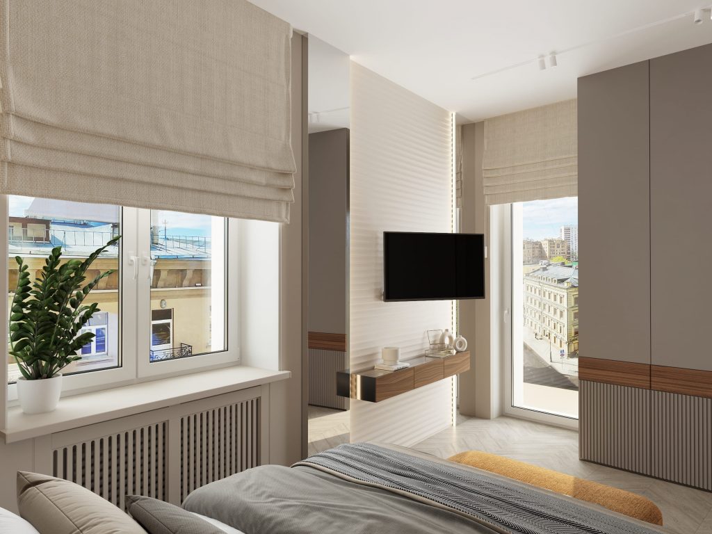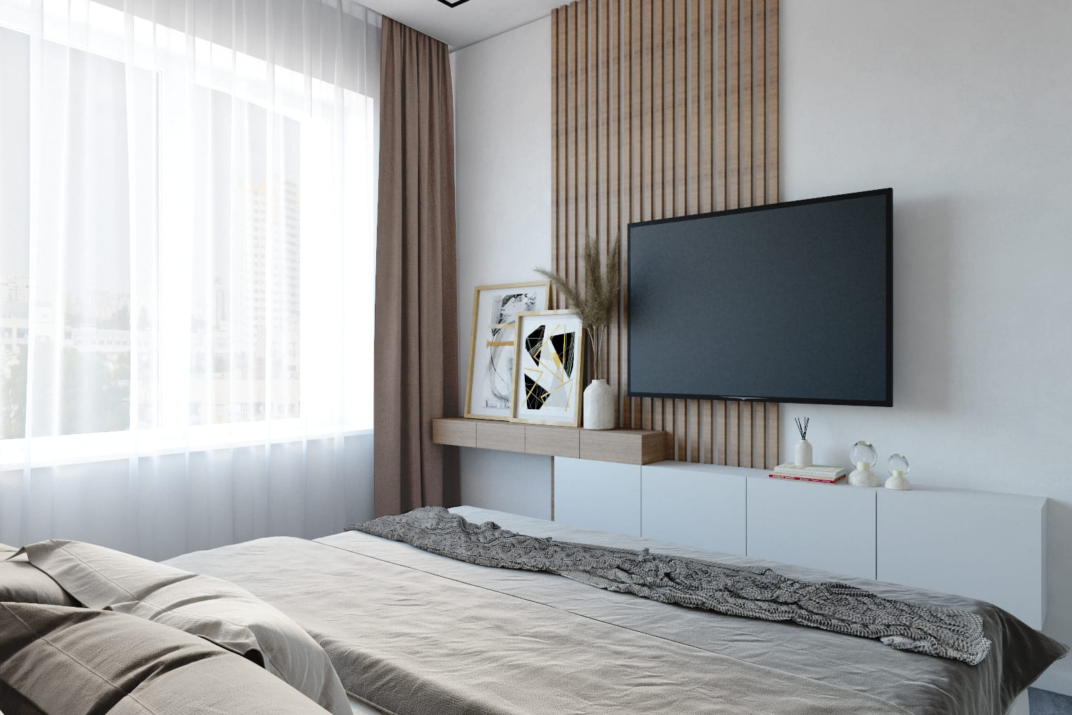 У окна — тюль и плотные кофейные шторы, регулирующие свет и уединённость. Напротив кровати — телевизор и лаконичная система хранения с белыми фасадами и деревянными вставками. Декор из постеров и сухоцветов добавляет уюта, а дизайн встроенных шкафов в спальне без ручек сохраняет пространство свободным от визуального шума.