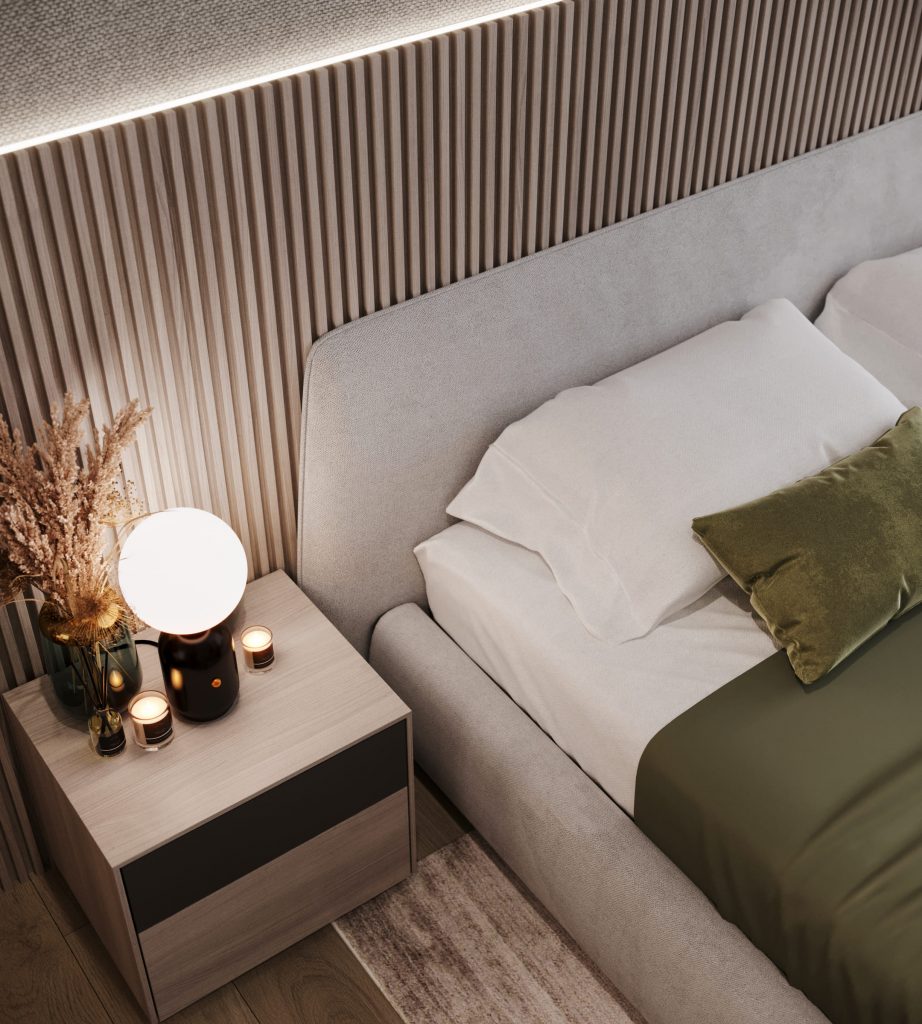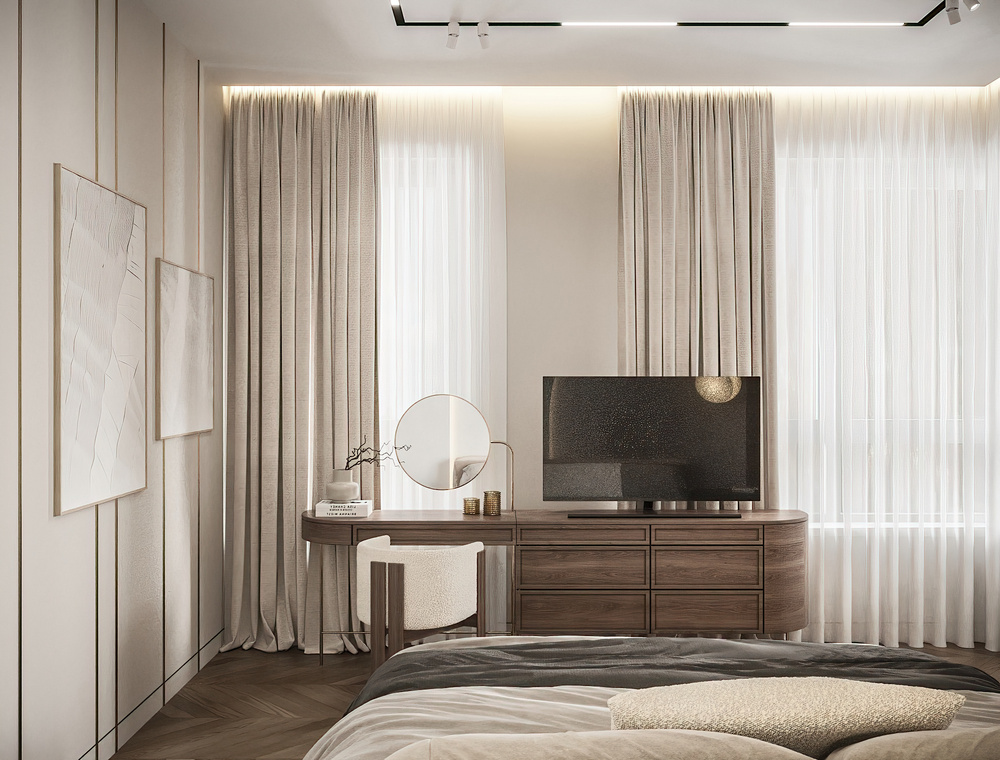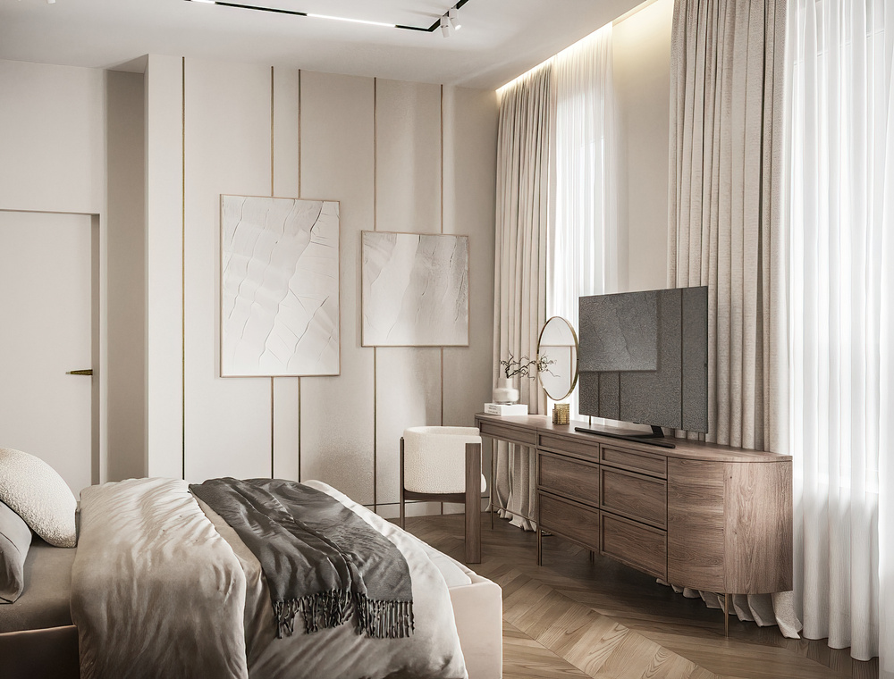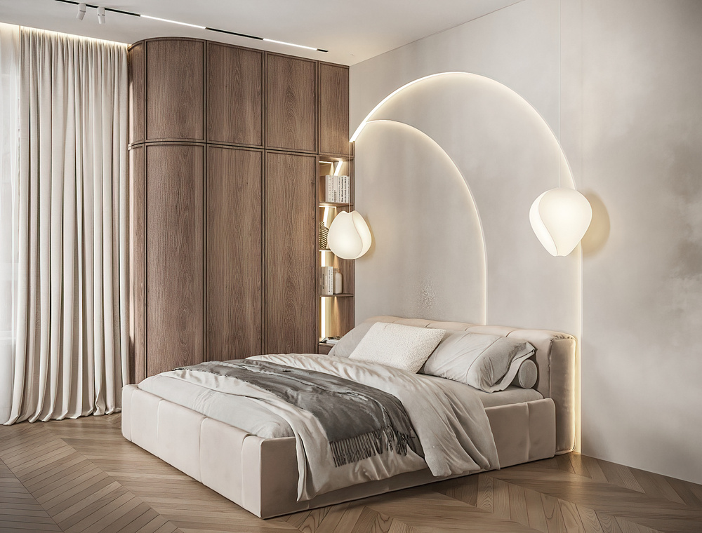 Интерьер построен на натуральных материалах и мягких природных оттенках и бежевом стиле, создающих атмосферу умиротворения. Центром композиции стало арочное изголовье с интегрированной подсветкой, которое формирует идеальный рассеянный свет.