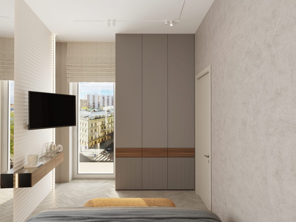 Спальня с двуспальной кроватью — фото дизайна представлено в нежных бежевых тонах, где функциональный минимализм органично переплетается с уютом и лёгкой женственностью.
