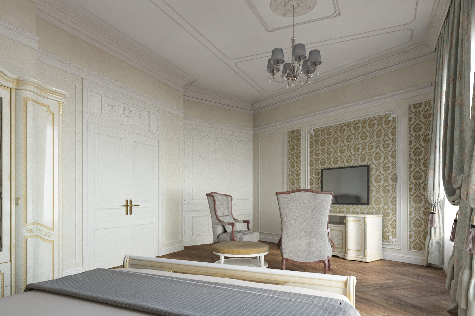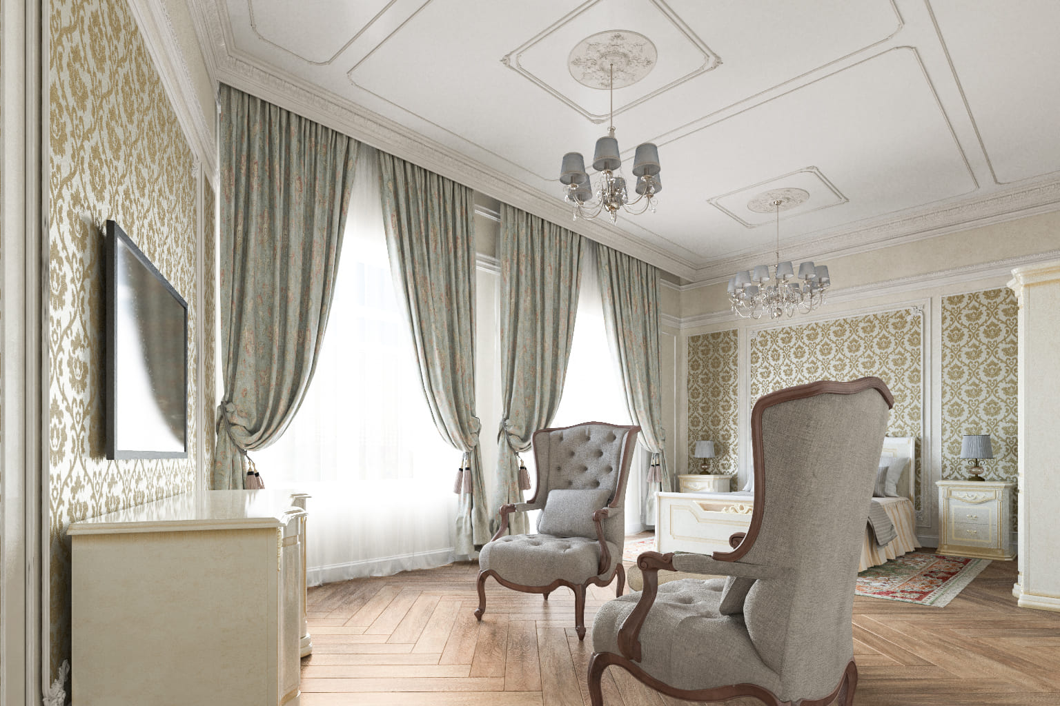 ◆ Функциональность: Вместительный шкаф, прикроватные тумбы со светильниками и уютная ТВ-зона с комодом и парой кресел.