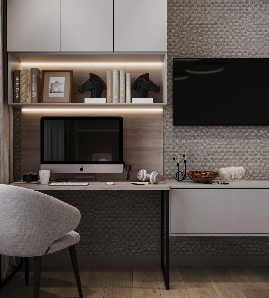 Особое внимание уделено бьюти-зоне со встроенным зеркалом с подсветкой, подвесным туалетным столиком и пуфом.