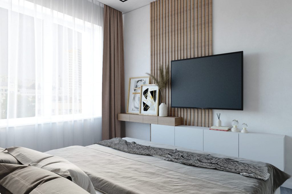 • Напротив — подвесная ТВ-панель, не загромождающая пространство;