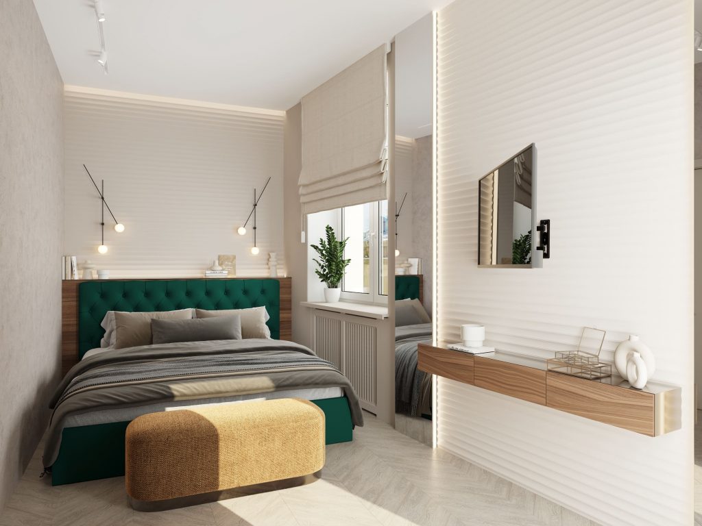 Недорогой дизайн спальни сочетает уют и практичность благодаря вместительному гардеробу и компактной консоли, создавая идеальный баланс эстетики и удобства.