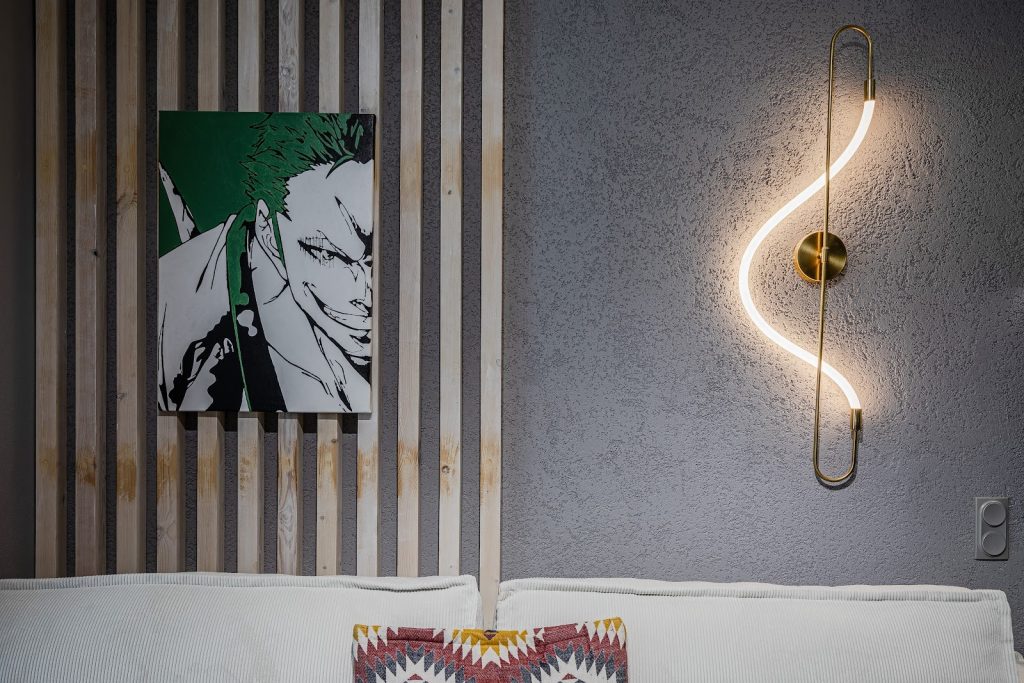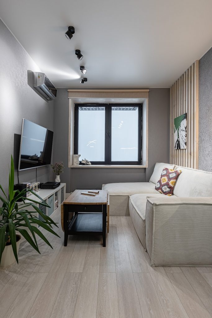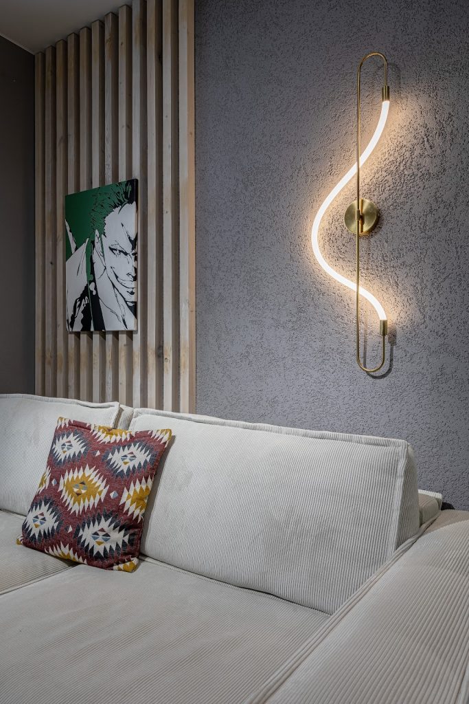 Место отдыха – фактурная штукатурка, серые моющиеся обои и деревянные рейки.