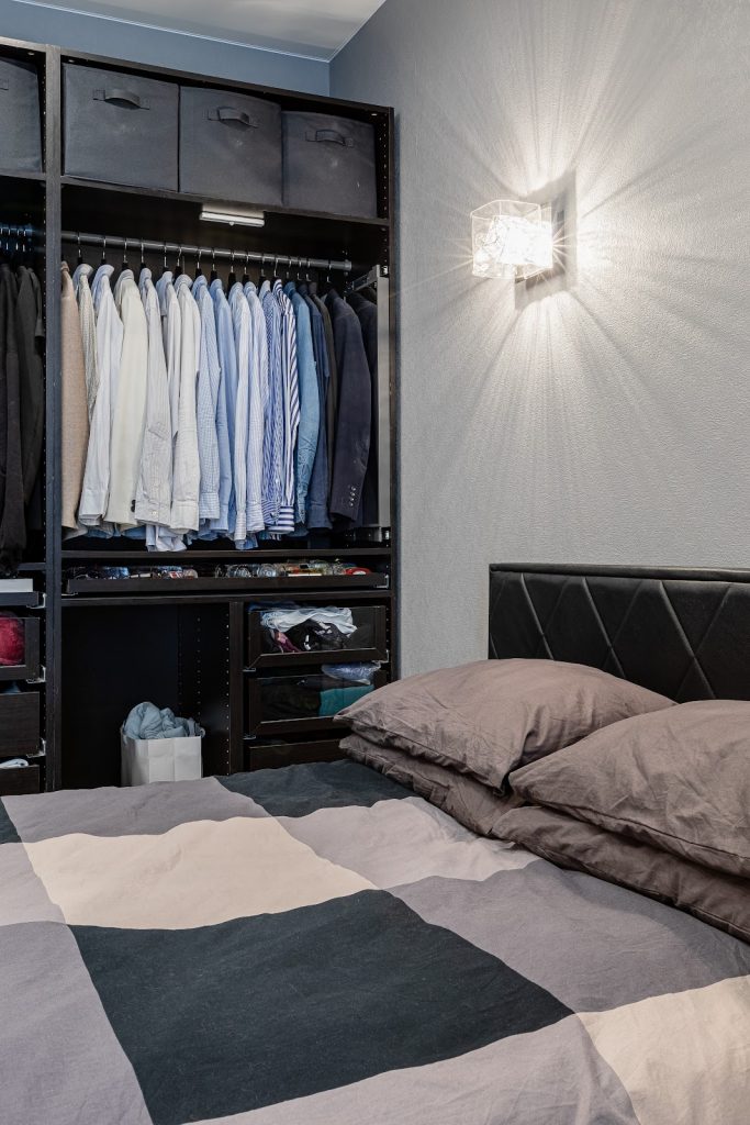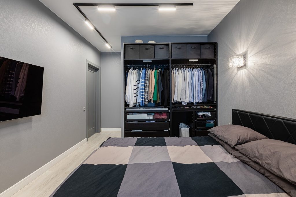 Гардероб организован в открытом шкафу по просьбе хозяев: вещи на штангах, мелочи в ящиках, несезон — в кофрах. Всё с подсветкой. В дальнейшем планируются фасады с авторской отделкой.