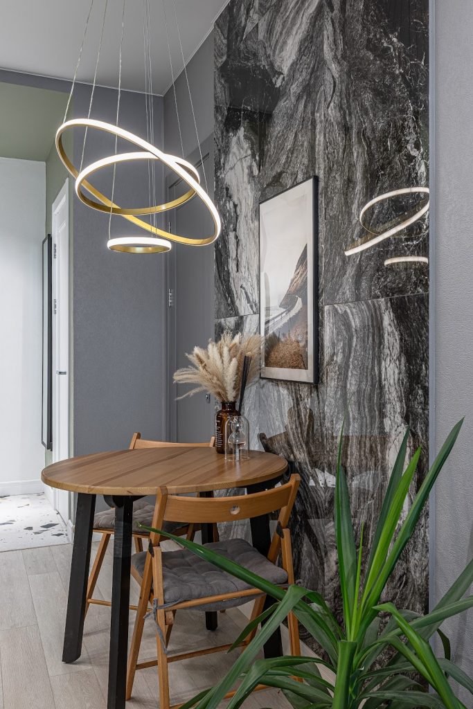 Красота в деталях: на фото можно рассмотреть, как ручки-кнопки золотистого оттенка круглой формы гармонируют с круглым же обеденным столом и люстрой над ним, состоящей из светодиодных кругов разного размера на подвесах.