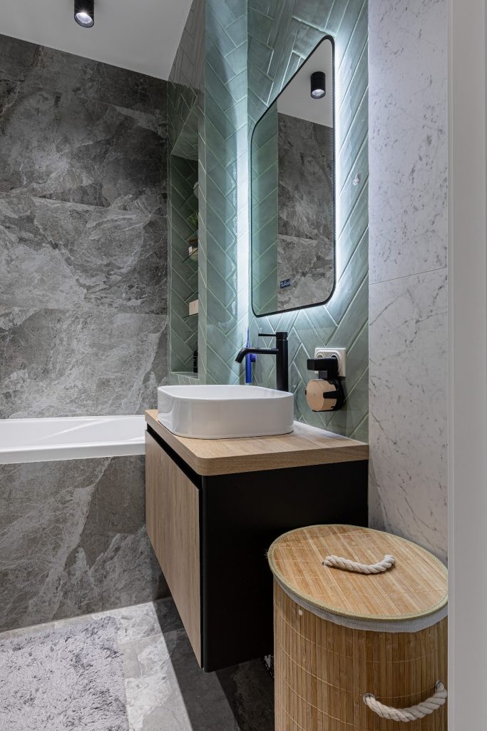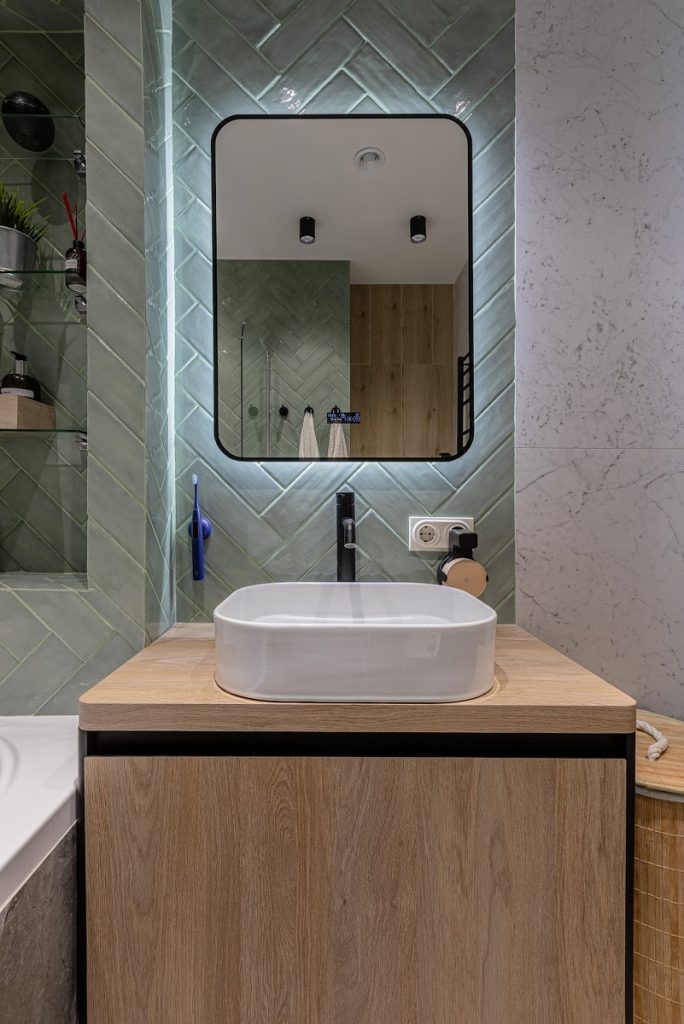 крупноформатная плитка под мрамор двух оттенков и плитка «кабанчик» зеленого оттенка, уложенной елочкой.