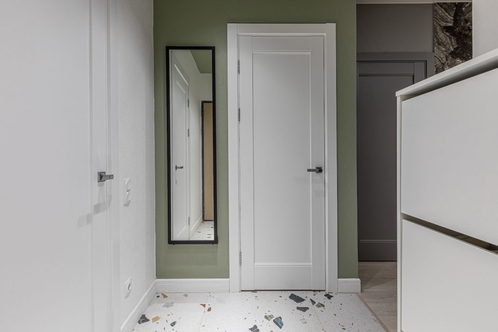 В противовес светлым стенам и дверям – одна из стен и потолок выкрашены зеленой краской, создавая современный образ евродвушки.