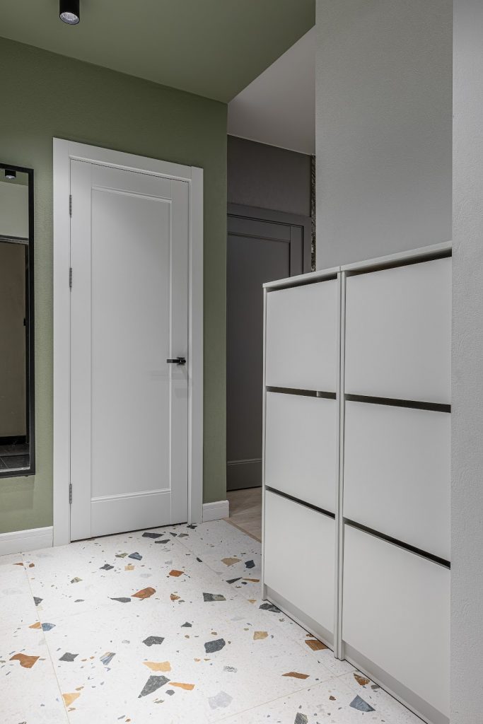 Для хранения обуви предусмотрен отдельный предмет мебели. Фасады выполнены в белом цвете без ручек.