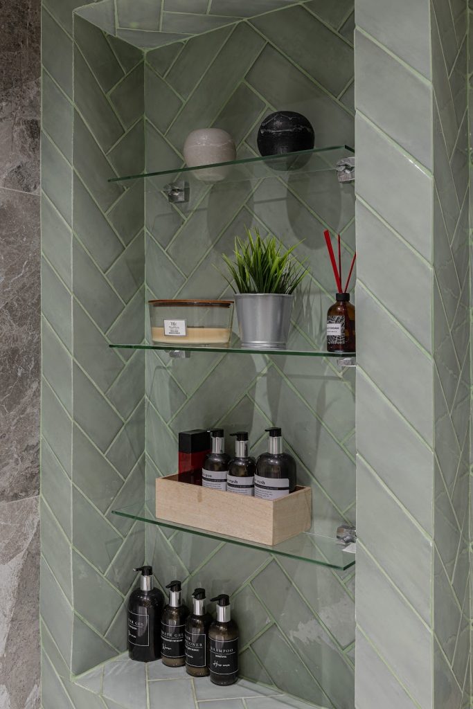 На фото видна ниша для хранения средств для душа и аксессуаров — ваш личный спа-уголок.