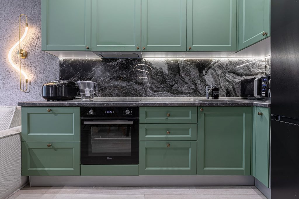 В этой евродвушке кухня стала стильным акцентным пространством. Угловой кухонный гарнитур, фасады с матовым покрытием насыщенного зелёного цвета с классической фрезеровкой удачно сочетаются с фартуком из серого керамогранита и серой столешницей.
