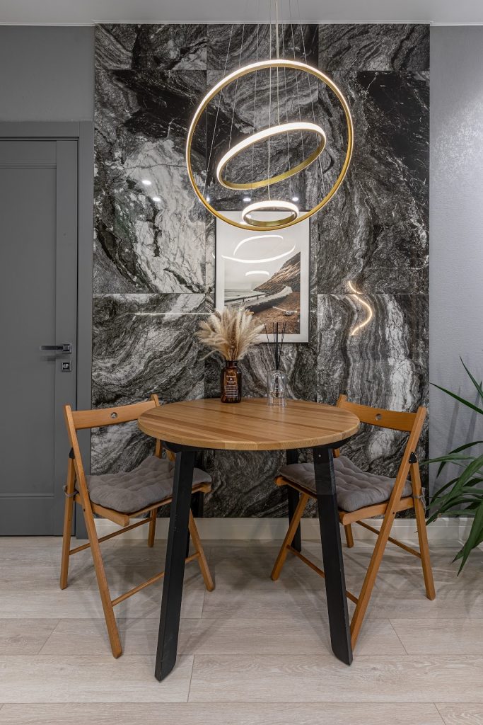 Кухонная зона и стена у стола – крупноформатный керамогранит.
