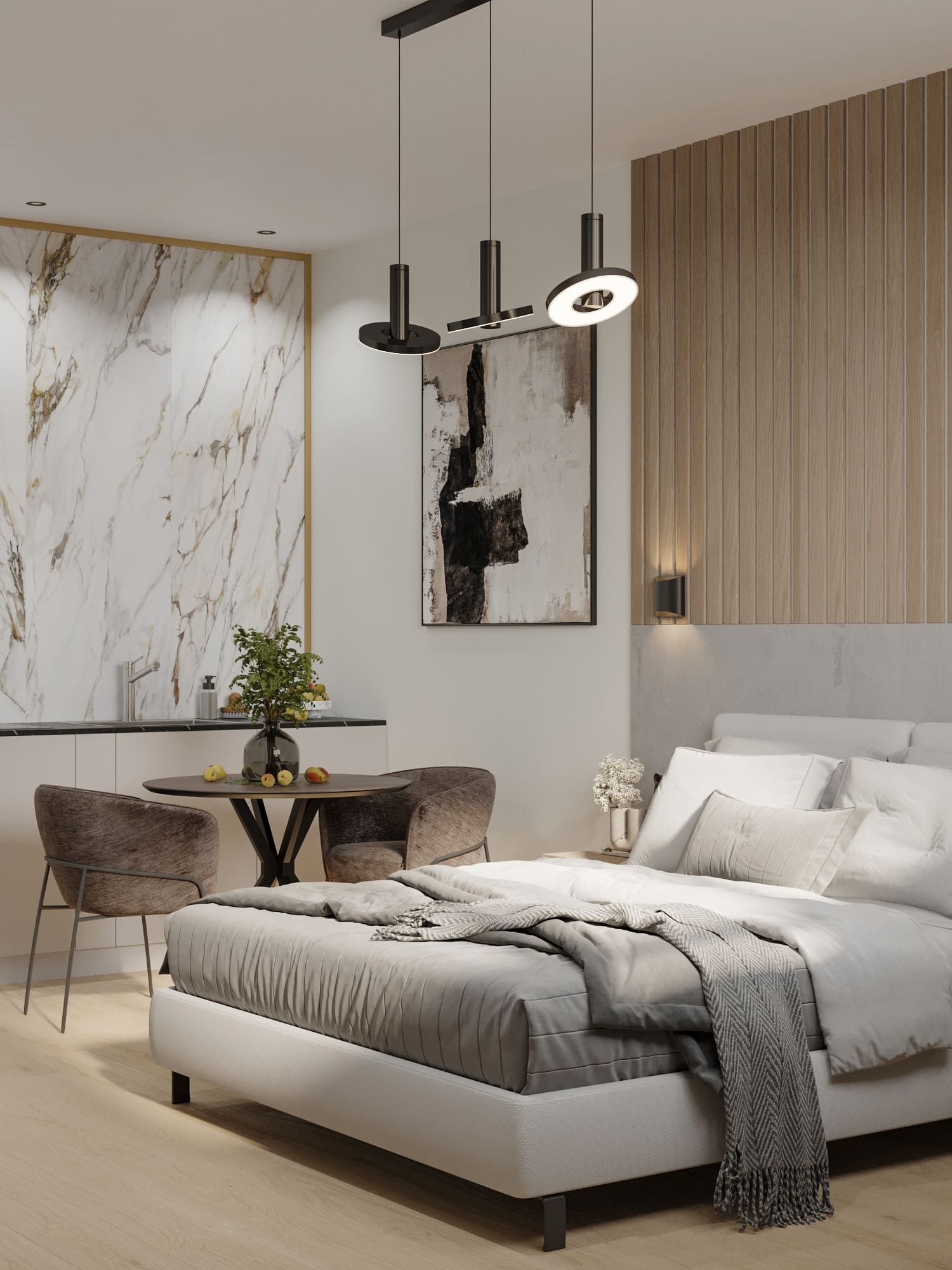 Зона кухни плавно переходит в спальное место. Вместо массивных перегородок – зонирование с помощью материалов и освещения. Деревянные панели за кроватью создают уют, а подоконник используется как мини-место для отдыха.