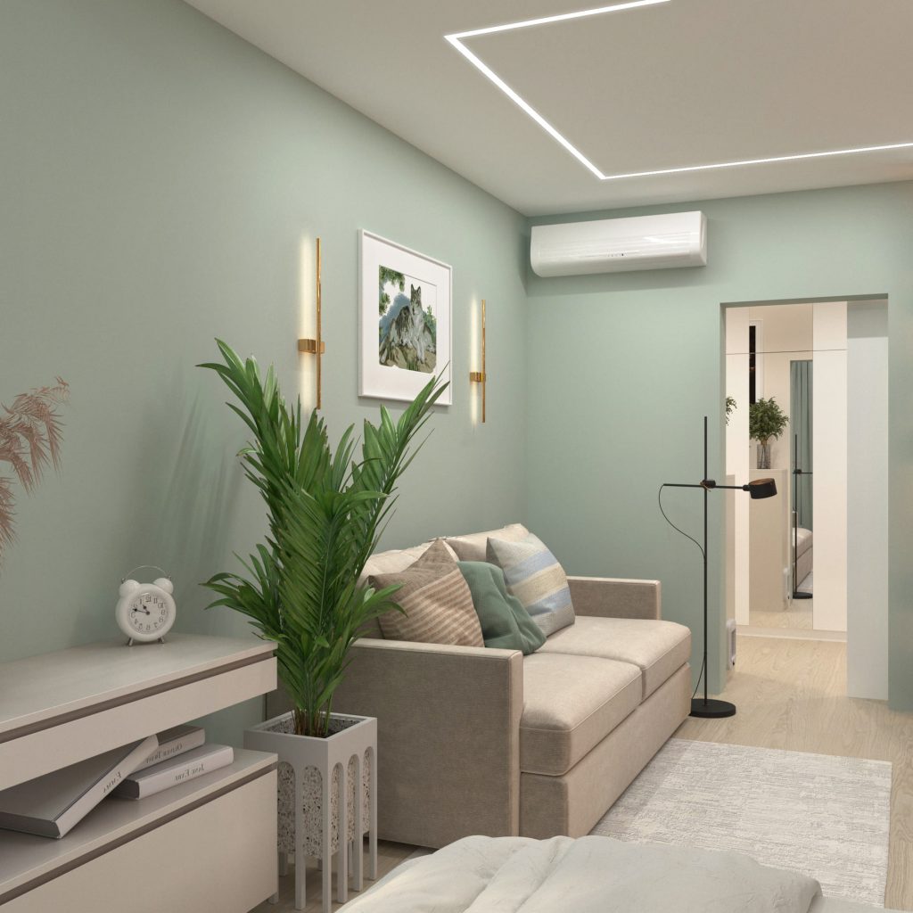 В прихожей — энергичные красные стены, создающие яркое первое впечатление и заряжающие динамикой. Переходя в гостиную-спальню, атмосфера меняется: глубокие зеленые тона дарят ощущение спокойствия и единения с природой.