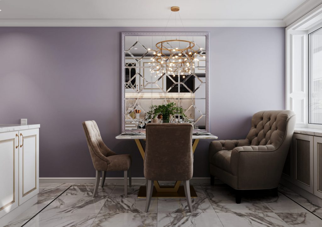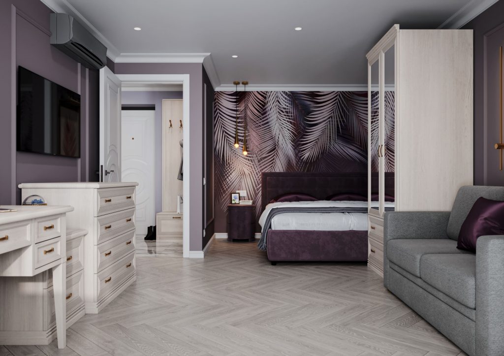 Эта квартира завораживает глубиной фиолетовой палитры — от нежных лавандовых полутонов до насыщенных сливовых и баклажановых акцентов. Такой смелый цветовой выбор делает интерьер эксклюзивным, придавая пространству ноты роскоши и творческой смелости.