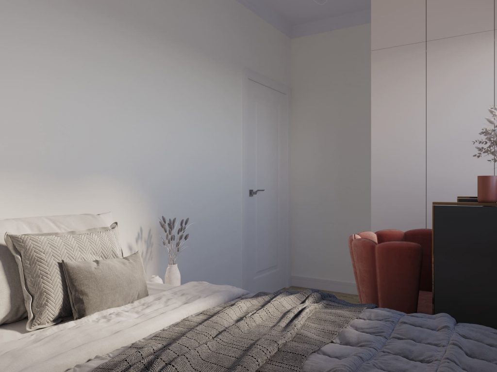 Интерьер этой квартиры построен на эффектном сочетании глубокого синего и энергичного оранжевого. Синий акцент на стене подчеркивает зону отдыха, создавая атмосферу спокойствия, в то время как оранжевые стены в спальне добавляют интерьеру тепла и уюта, создавая яркий и динамичный акцент в помещении.