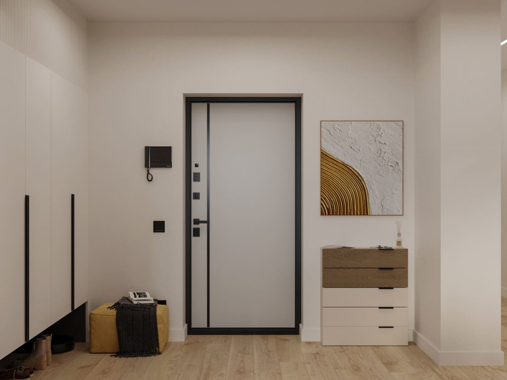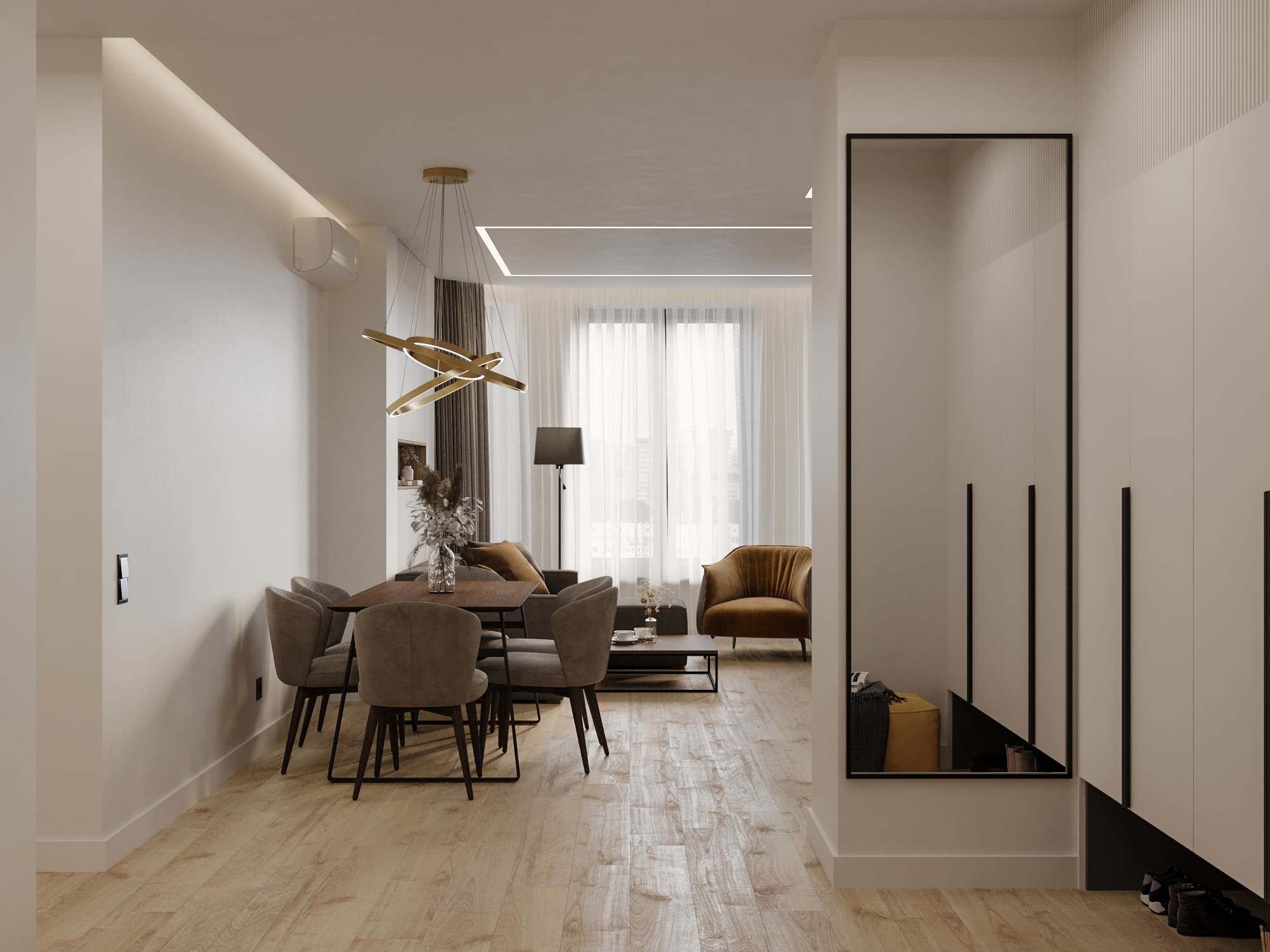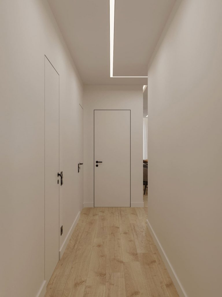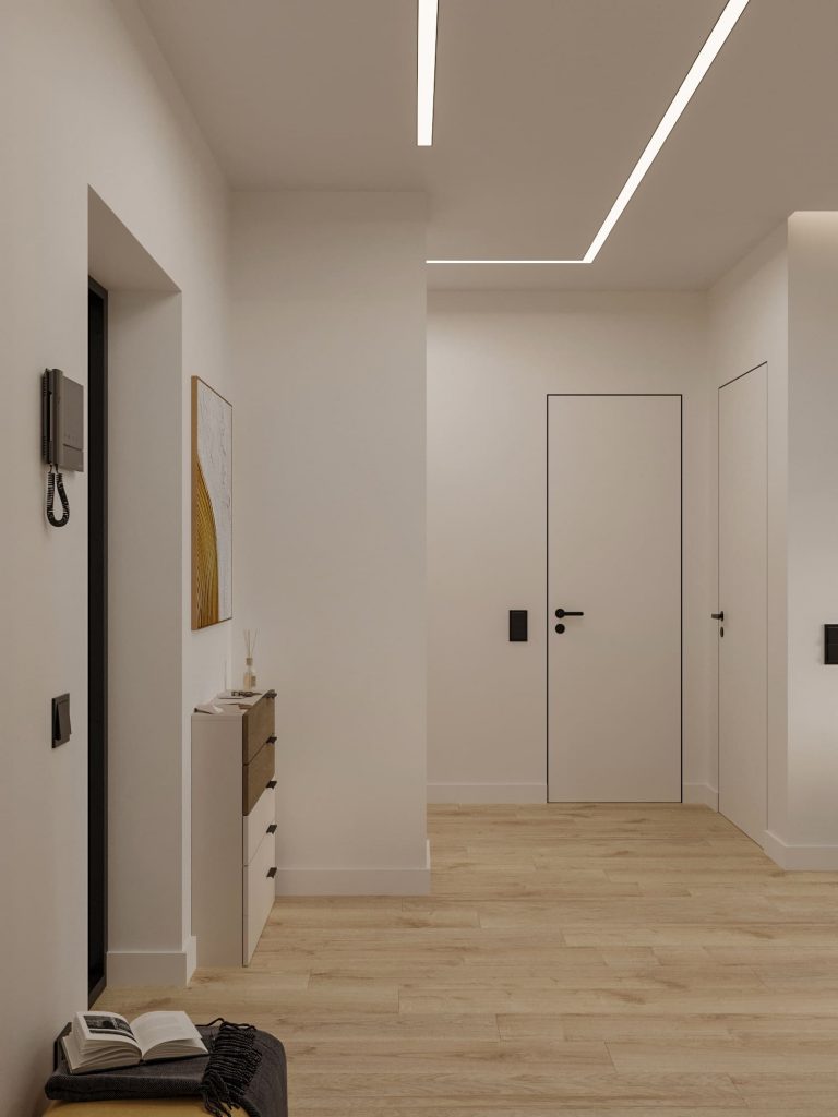 Заказчики – молодая пара. Планировка заказчиков полностью устраивала, мы лишь немного ее поменяли, чтобы расширить коридор и разместить там большой шкаф для вещей. Стиль был выбран классический, с большим количеством декоративных элементов в виде молдингов, панелей и тд. Но при этом достаточно современный благодаря выбранным оттенкам, светлым стенам и современной мебели и светильникам.