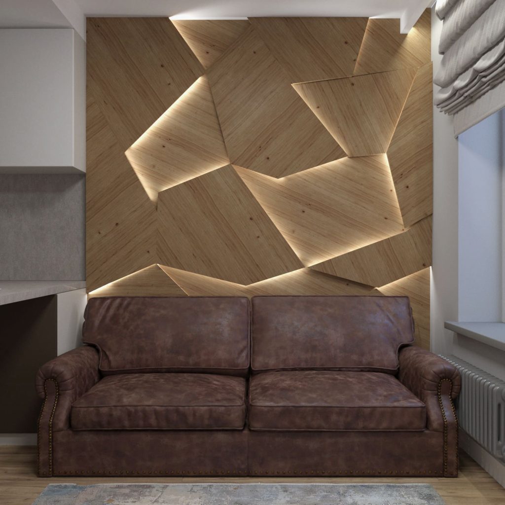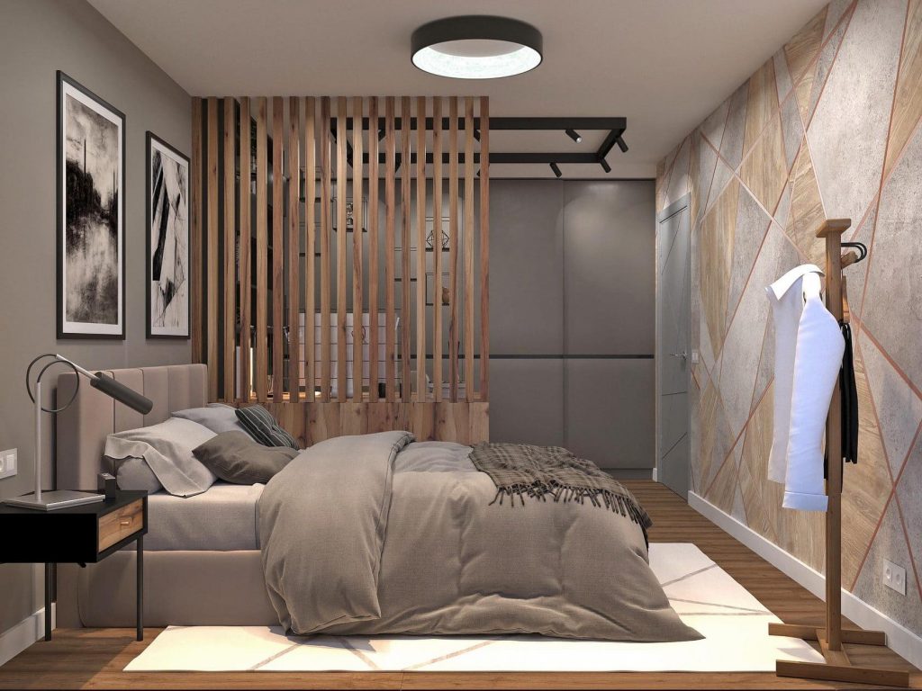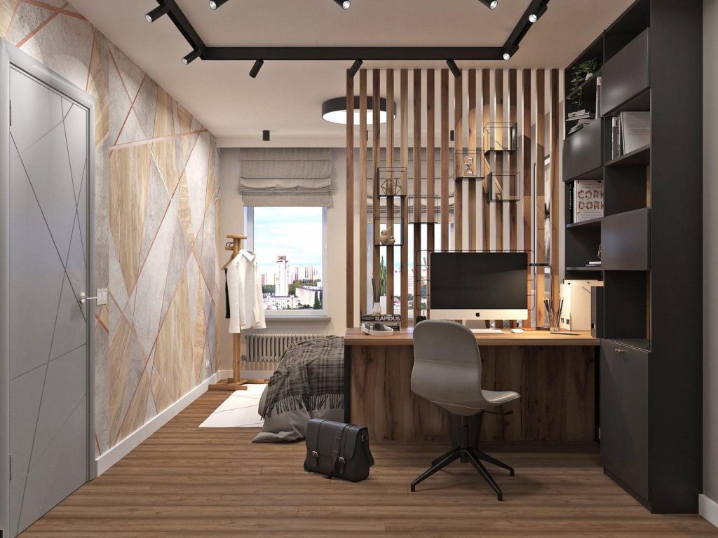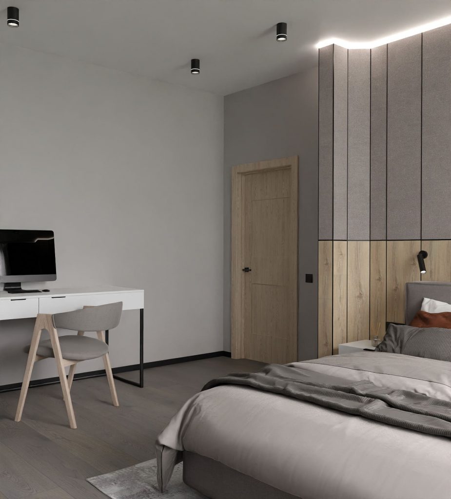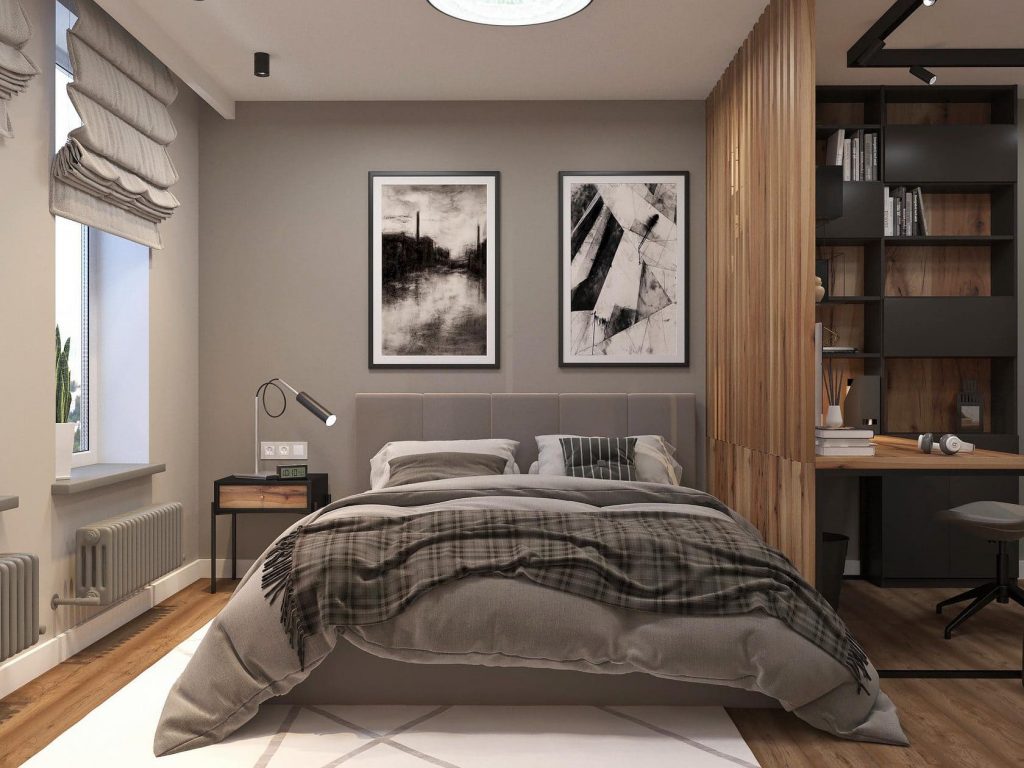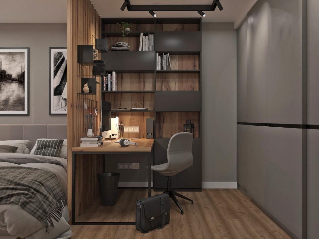 Заказчик просил частично переделать существующий проект другого дизайнера, по которому уже был сделан ремонт с ошибками, при этом нужно было подстроиться под общую стилистику квартиры. Главным приоритетом было удобство использования пространства: большое рабочее место, организация хранения, зонирование спальной зоны от рабочей. В гостиной нужно было только декорировать и звукоизолировать стену за диваном. Мы решили эту задачу с помощью подбора мебели по индивидуальным размерам и зонирования перегородкой: декоративные панели МДФ будут выполнять функцию звукоизоляции.