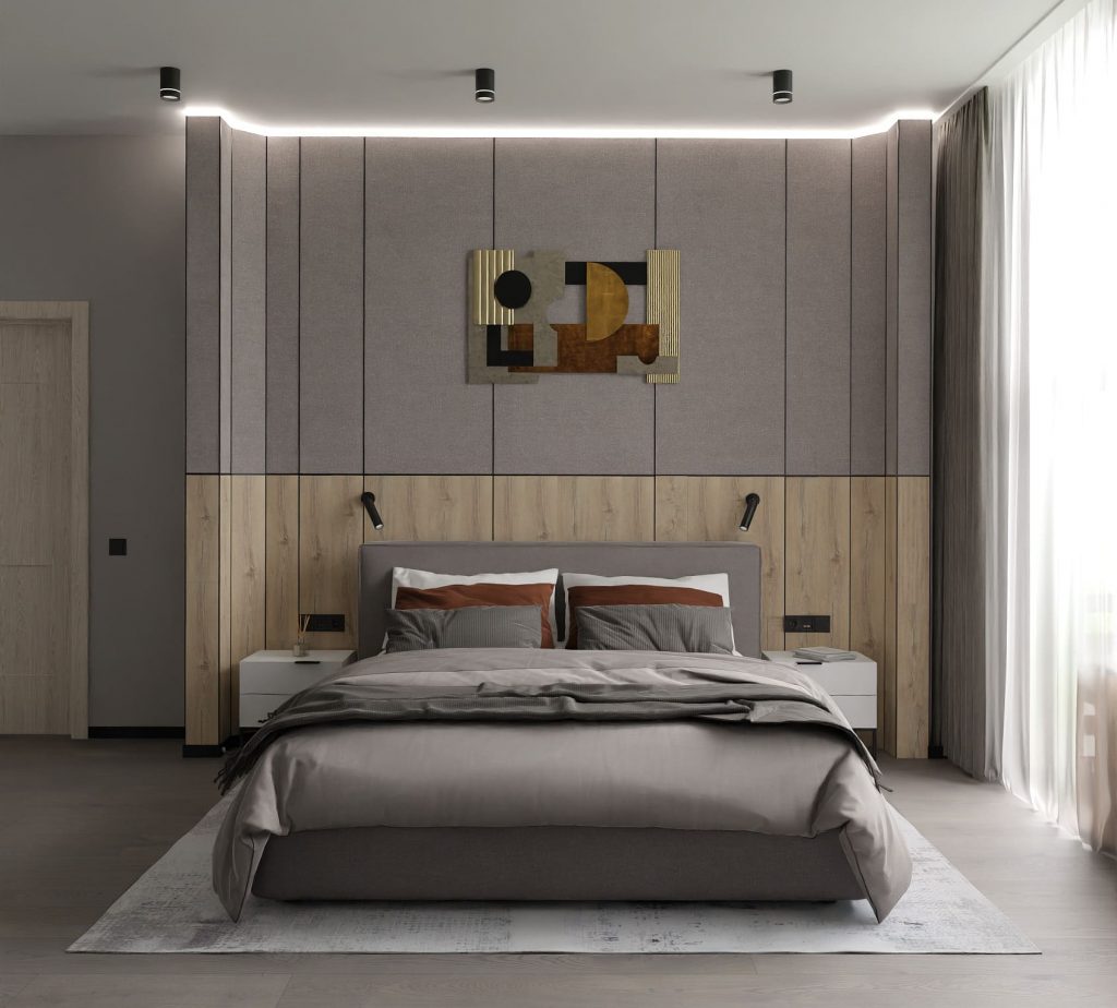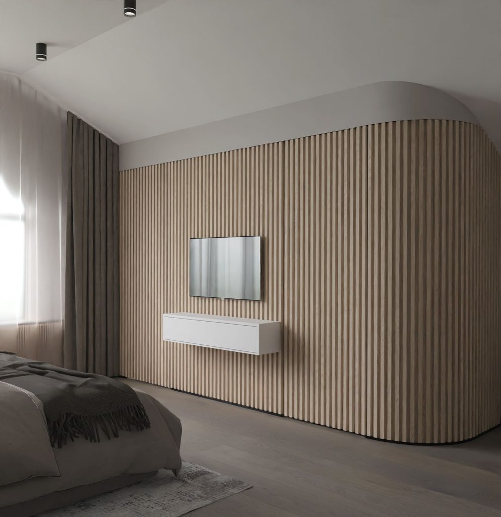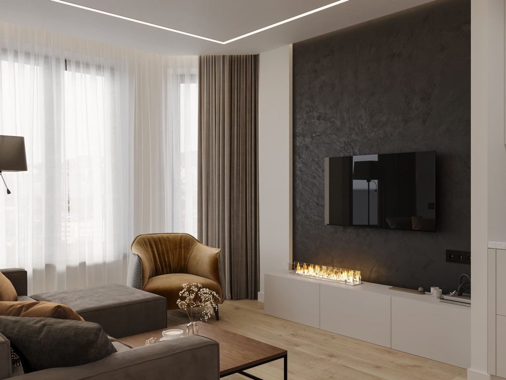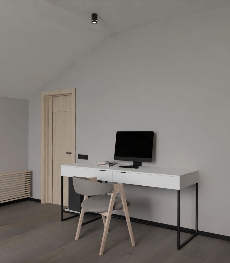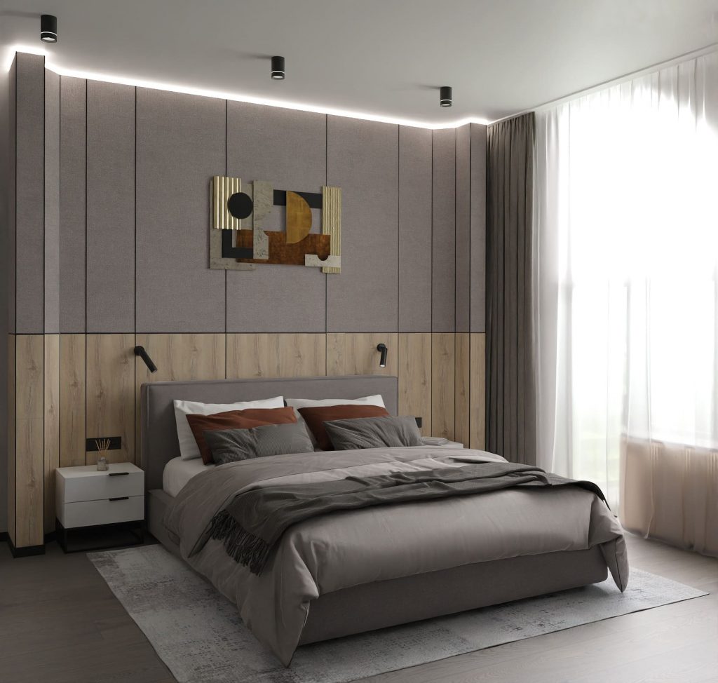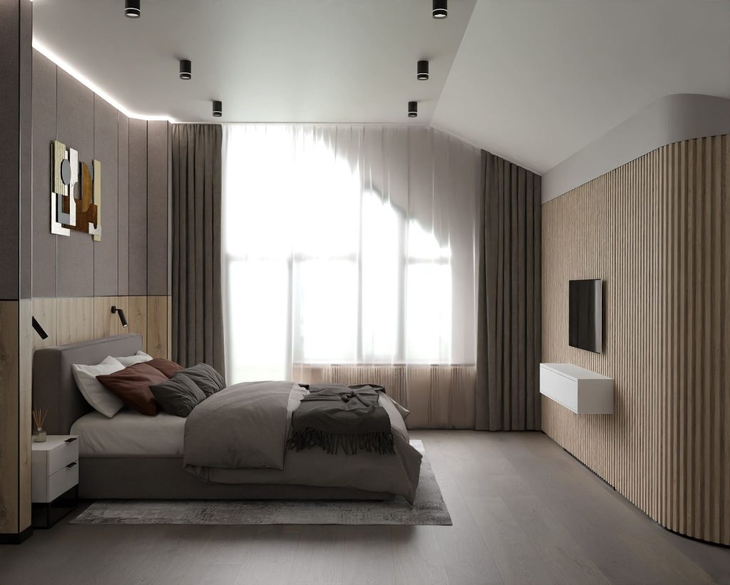 Заказчик просил частично переделать существующий проект другого дизайнера, по которому уже был сделан ремонт с ошибками, при этом нужно было подстроиться под общую стилистику квартиры. Главным приоритетом было удобство использования пространства: большое рабочее место, организация хранения, зонирование спальной зоны от рабочей. В гостиной нужно было только декорировать и звукоизолировать стену за диваном. Мы решили эту задачу с помощью подбора мебели по индивидуальным размерам и зонирования перегородкой: декоративные панели МДФ будут выполнять функцию звукоизоляции.