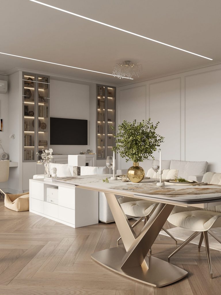 В разработке был только первый этаж двухэтажного загородного дома. Задачей было сделать интерьер в стиле современная классика, при этом несложный для исполнения, а также разместить зону гостиной и столовой в довольно большом, но проходном помещении. При разработке интерьера мы сделали акцент на светильники, что позволило не перегружать интерьер декоративными деталями на стенах, а ограничиться молдингами и высокими карнизами. Что бы несколько отделить пространство, использовали реечные перегородки.