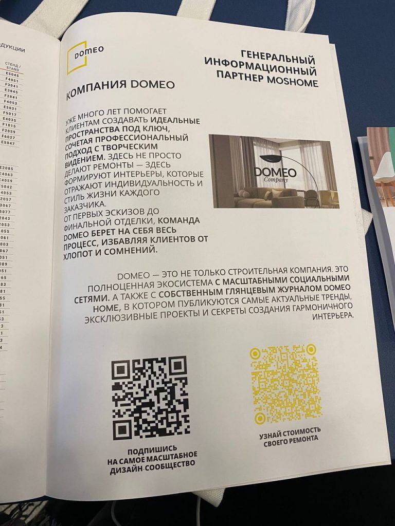 Выставка MosBuild проходила в Crocus City Hall, где компания Domeo выступила информационным партнёром. На площадке работал наш промо-персонал: коллеги рассказывали посетителям о компании, делились информацией о наших услугах и знакомили гостей выставки с возможностями Domeo.