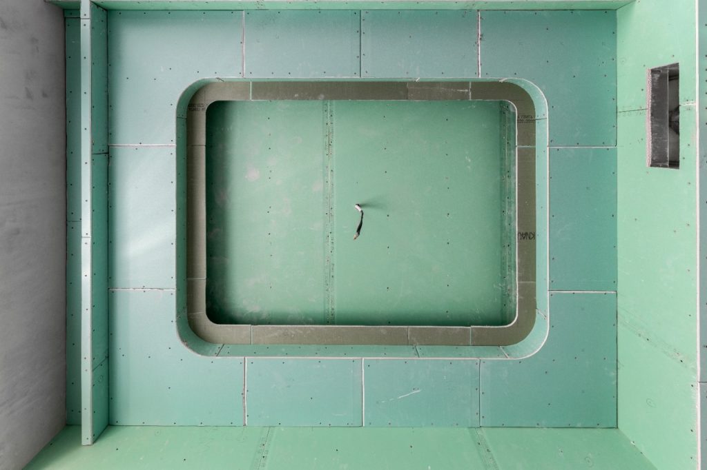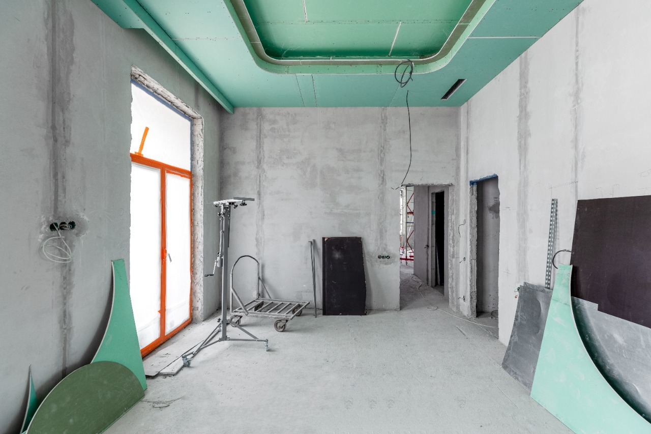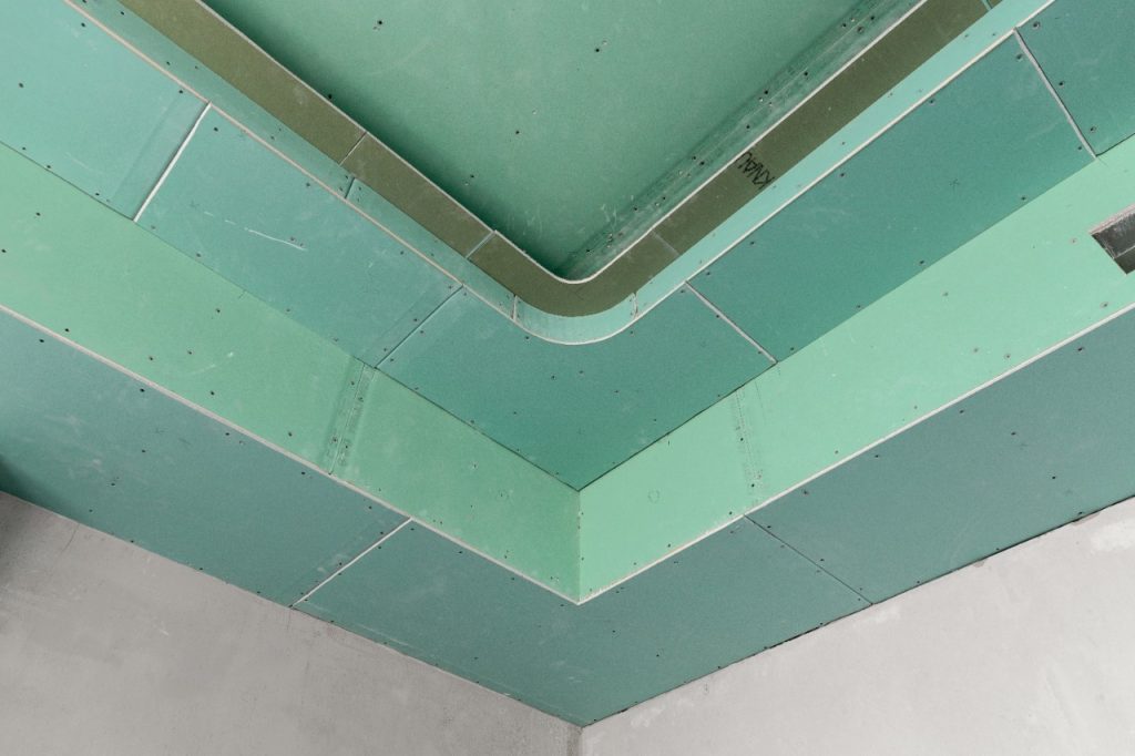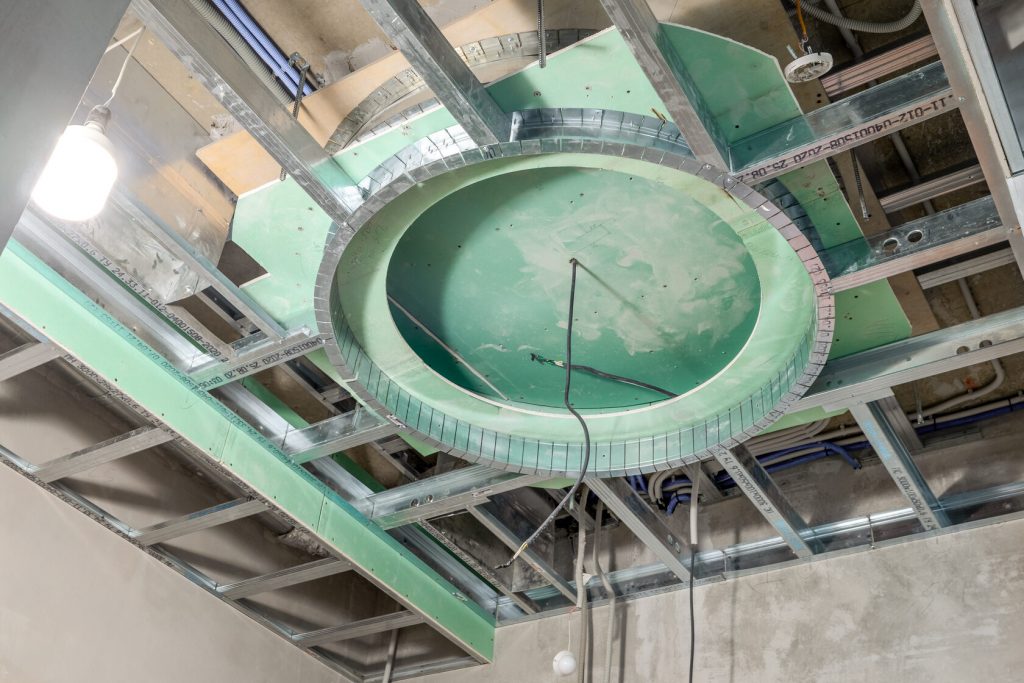 Основа потолка — каркас из классического металлического профиля с ячейкой 40 на 50 — один из самых популярных способов крепления различных строительных материалов — обшивается листами ГКЛв в два слоя. Здесь используются усиления в виде стальных труб для создания дополнительной жесткости под нестандартные конструкции. Вся работа — разметка, изгибы, подгонка — выполняется вручную по индивидуальным чертежам. Иногда сложные конструкции собираются отдельно, после чего крепятся к основному потолку.