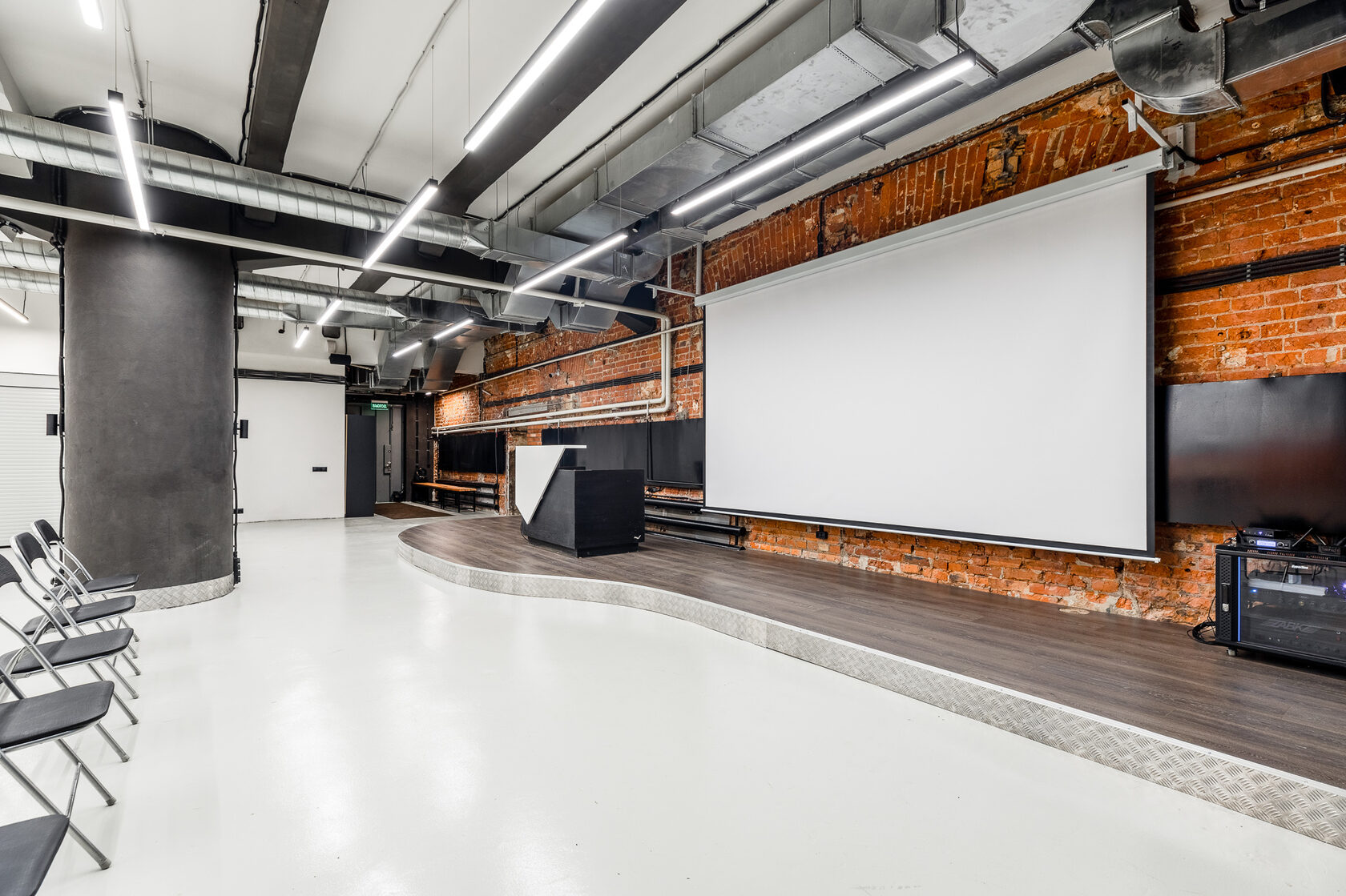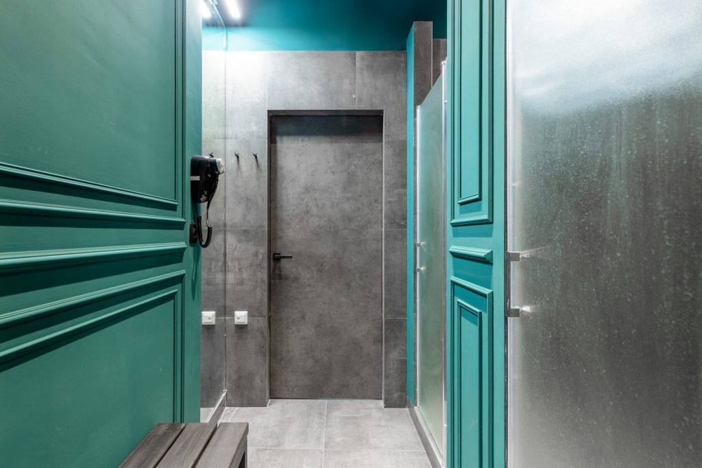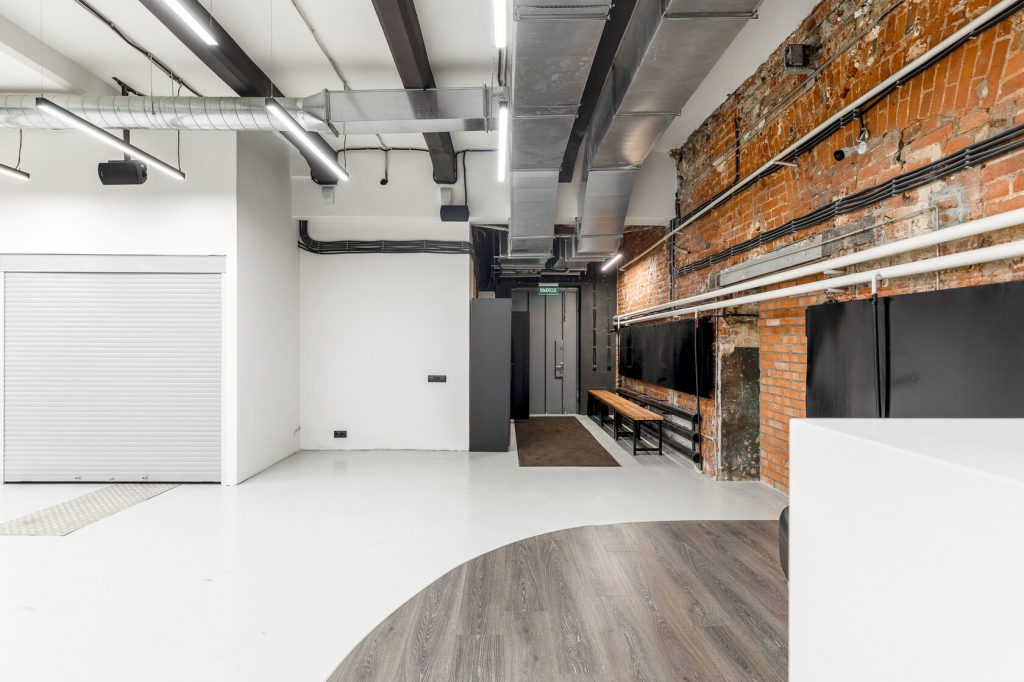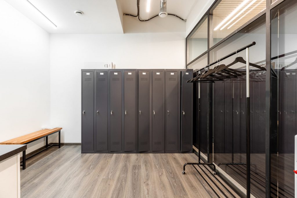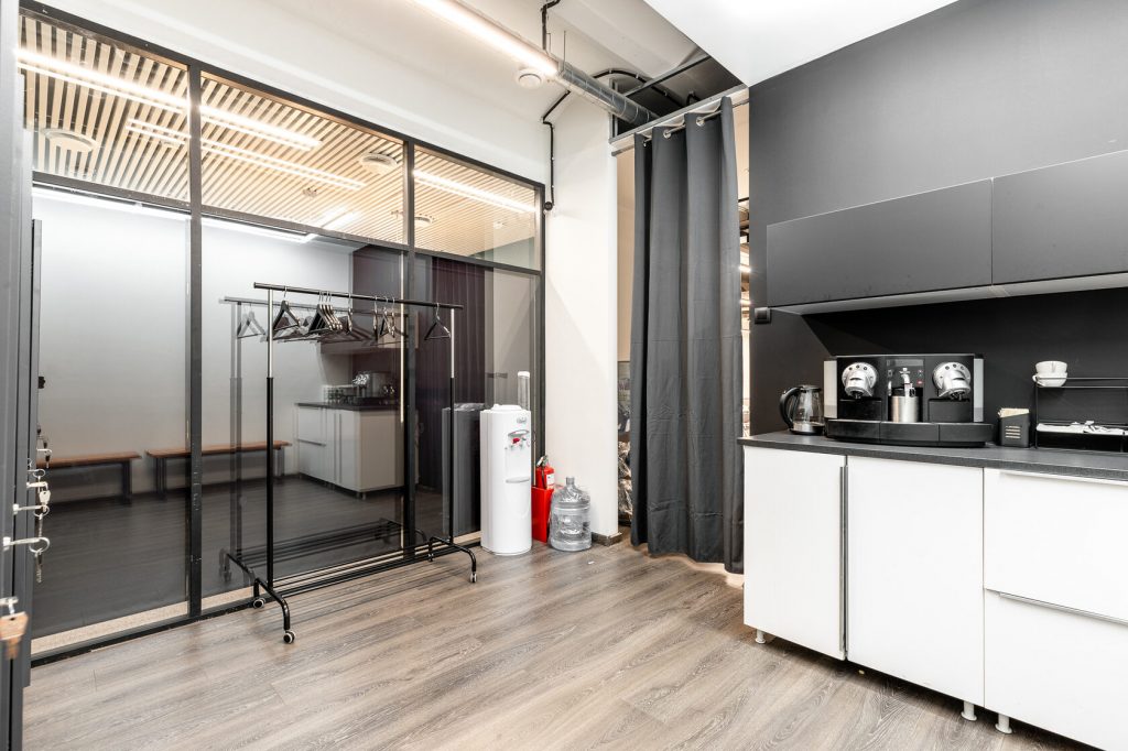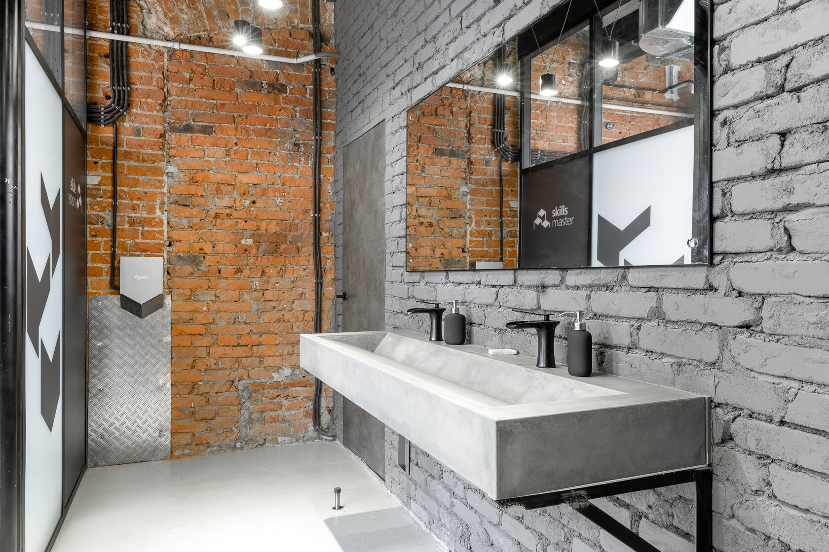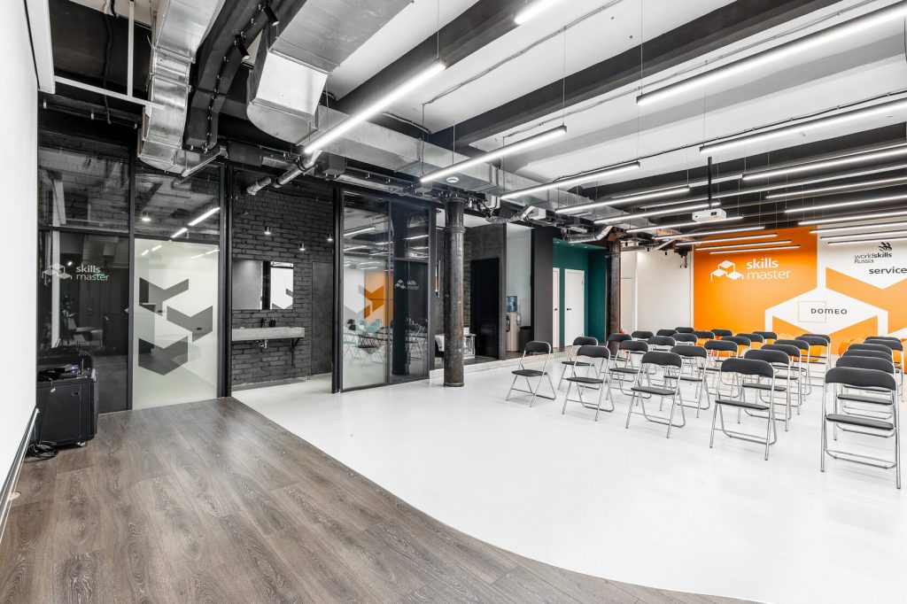 В помещении предусмотрено два сан.узла с душевыми. Небольшая кухня трансформируется в пространство для проведения этапа чемпионата «общение с заказчиком». Зона проведения практического блока без отделки трансформируется в комнату для переодевания, куда стелется каучуковое покрытие, а в углублениях стен кладутся мягкие подушки для отдыха.