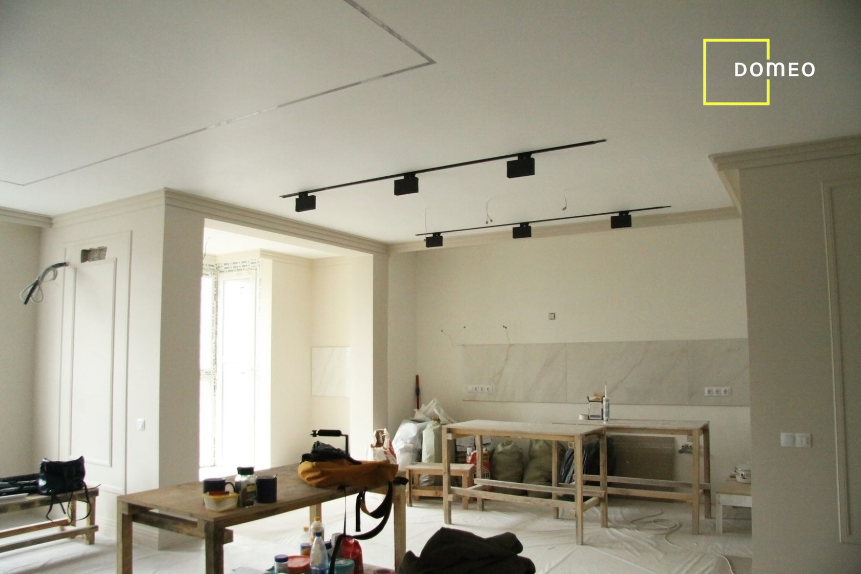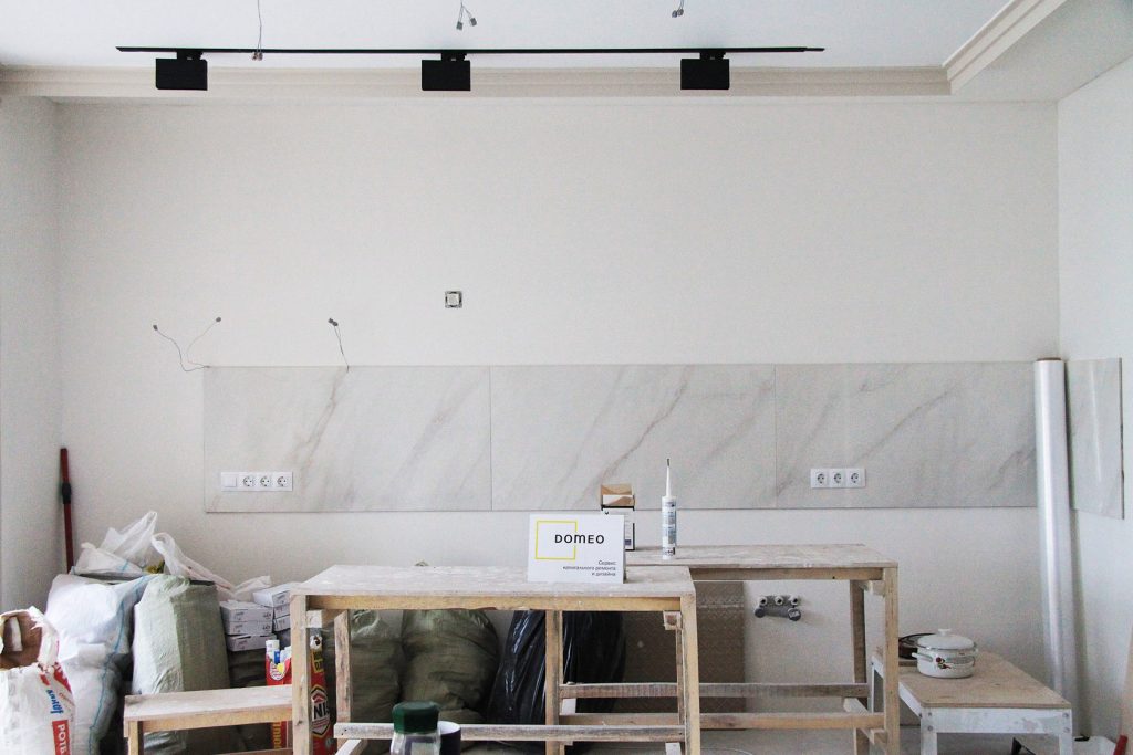 Мы отвечали за черновые и чистовые работы: отделку пола, стен, потолка, установку встроенных светильников, кухонного фартука и плитки в ванной