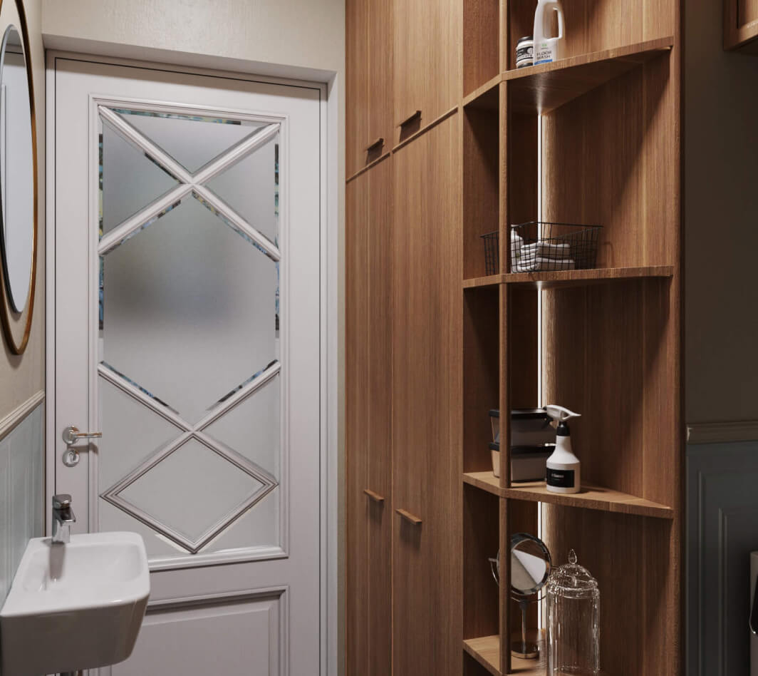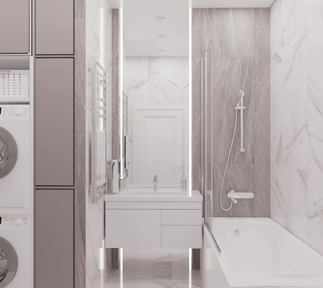 Основу палитры составляют легкие пастельные тона: молочные, пудровые, серые, бежевые, оливковые. Дизайнеры DOMEO умело расставили акценты проекта с помощью ярких деталей – мебели и аксессуаров насыщенного изумрудного, лимонного, фиолетового и синего цвета